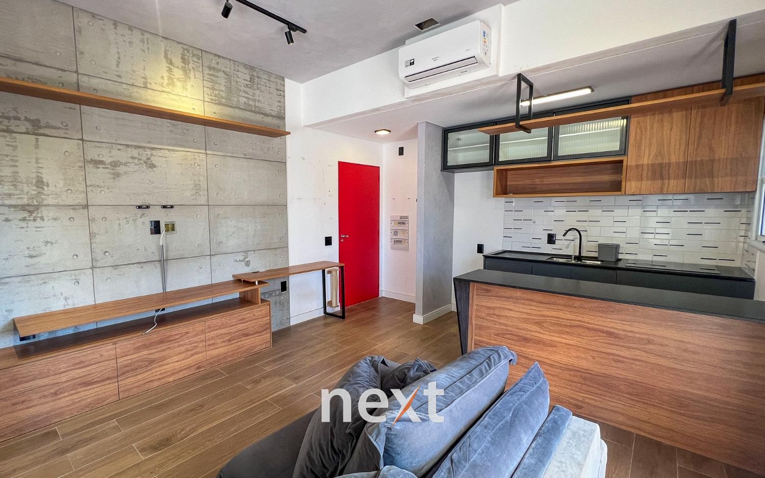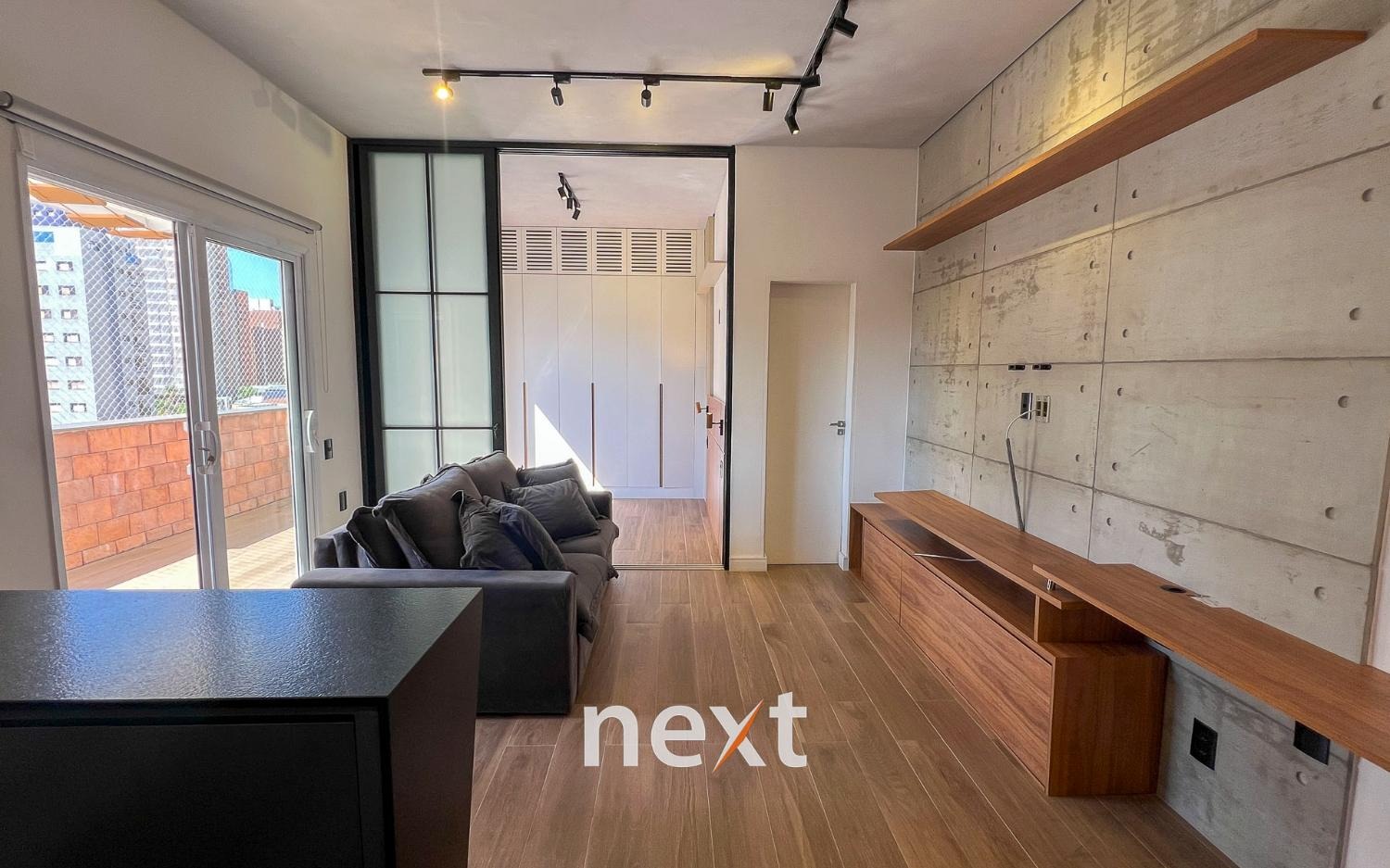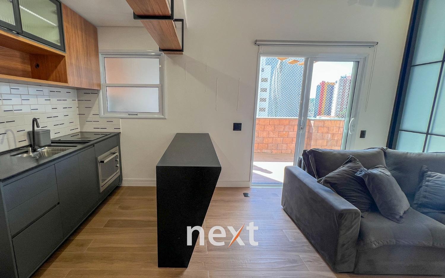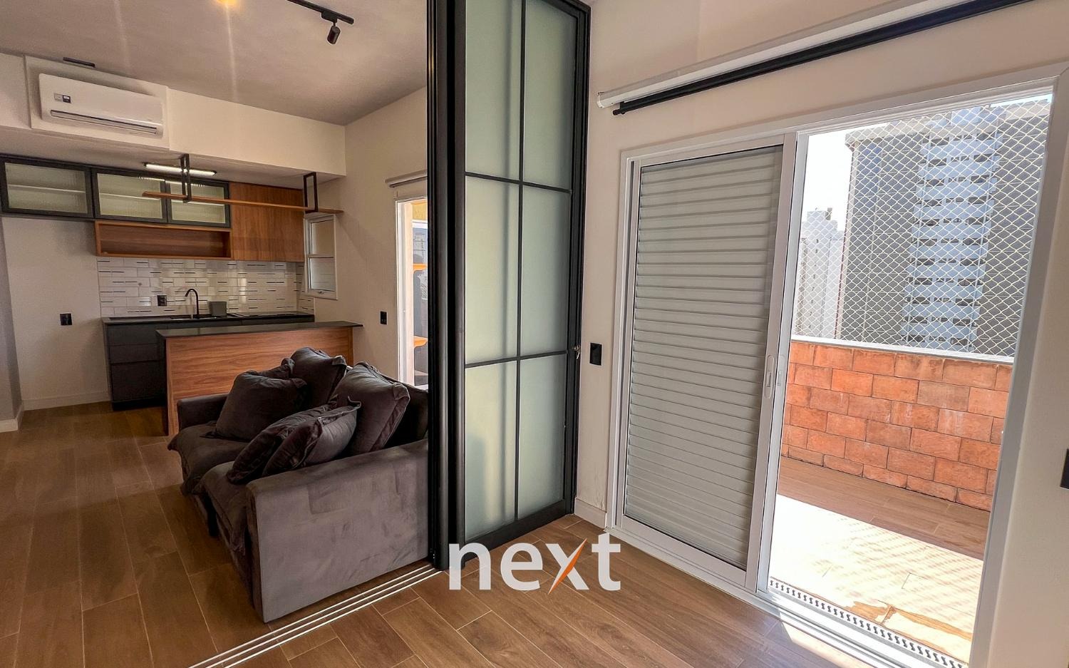 Sala de estar com sofá e ar condicionado, quarto com armários planejados e cozinha com forno e cooktop. Sacada estendida e espaço para móveis externos.