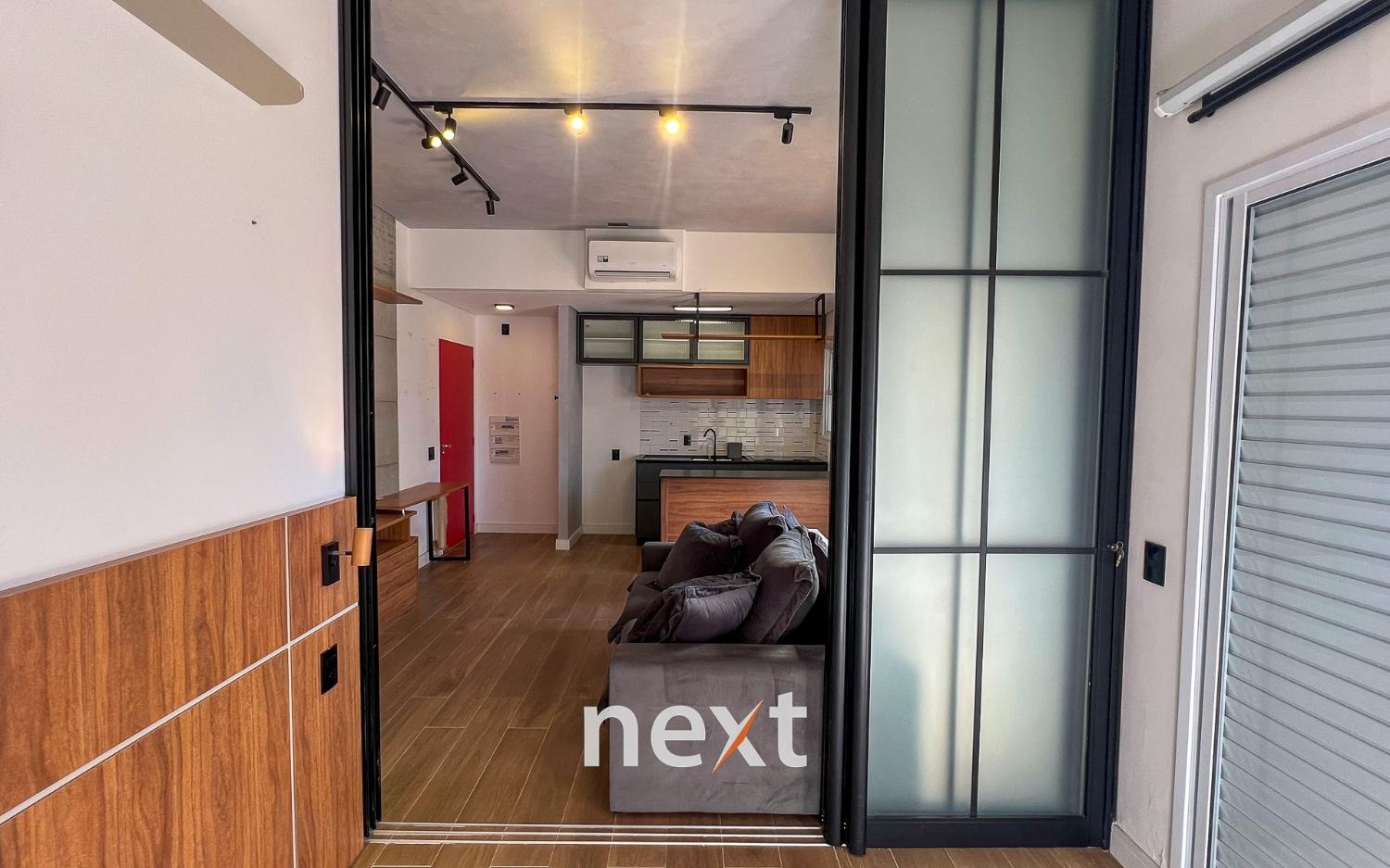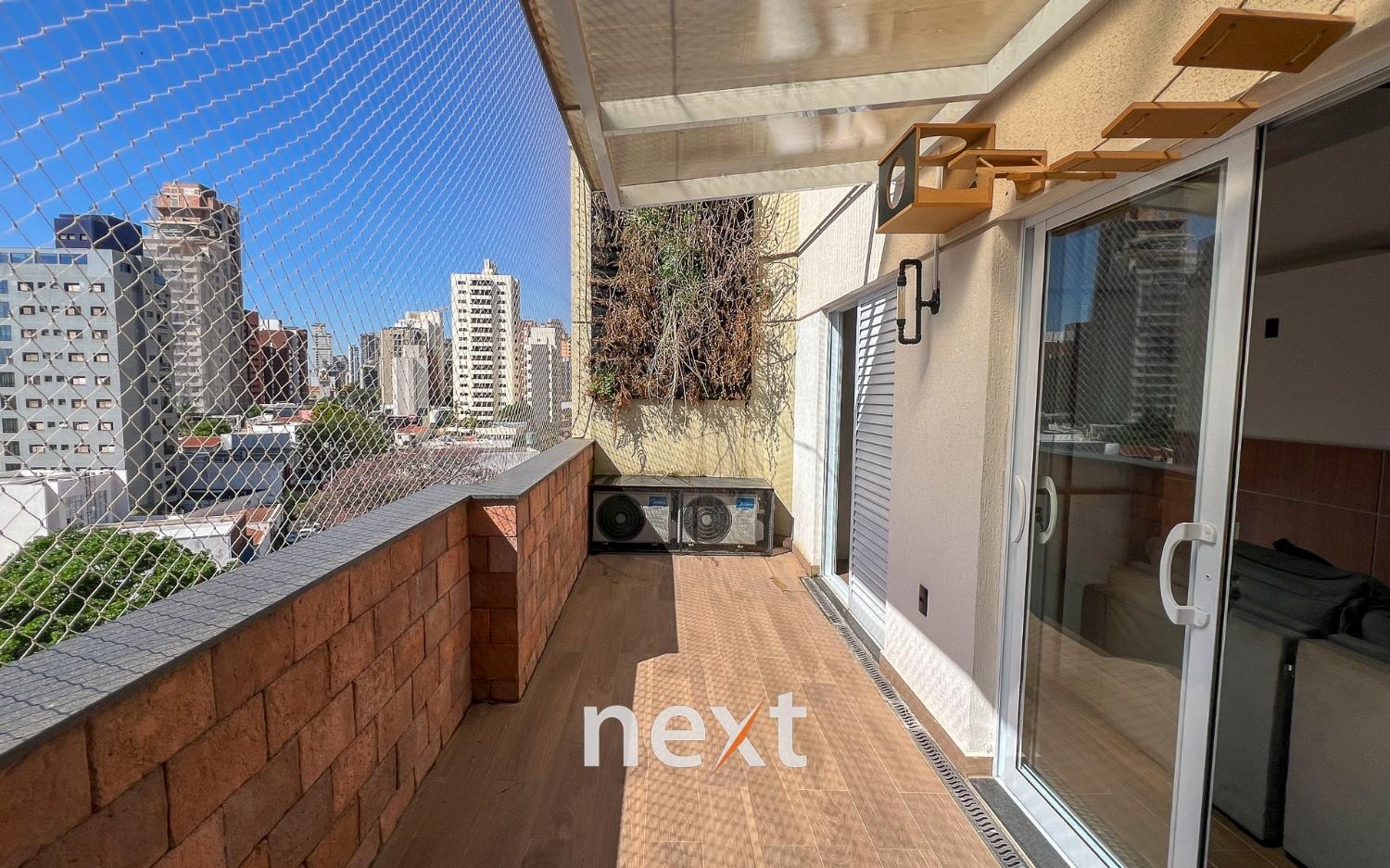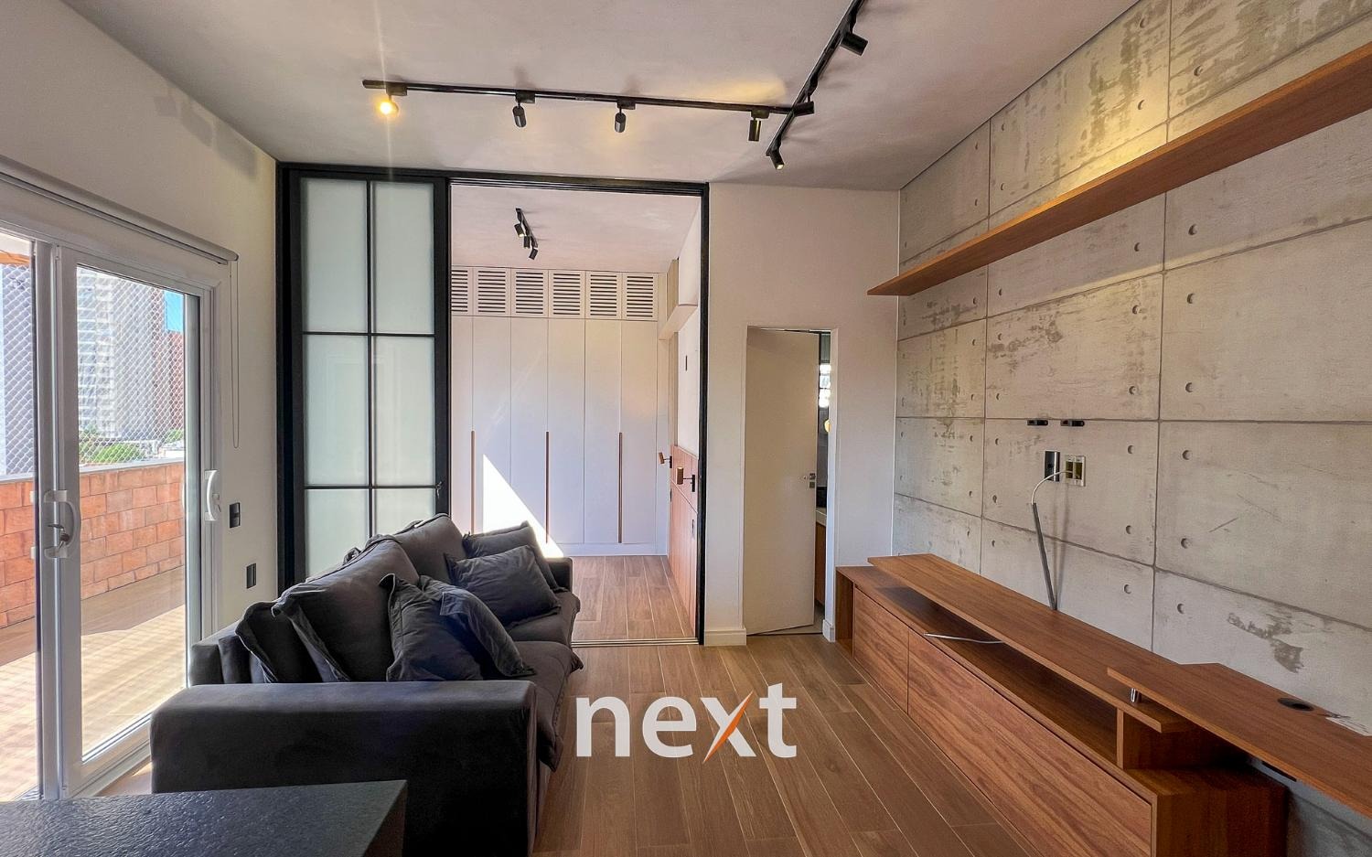 Sala de estar com sofá e ar condicionado, quarto com armários planejados e cozinha com forno e cooktop. Sacada estendida e espaço para móveis externos.
