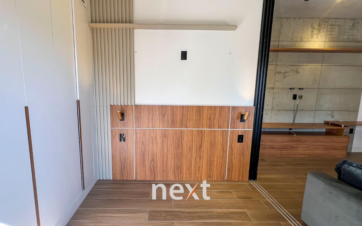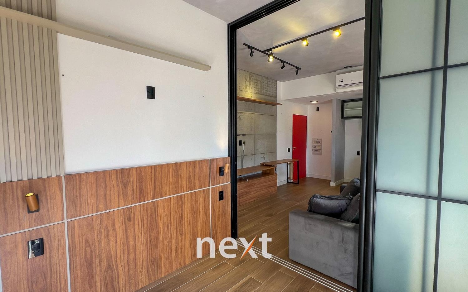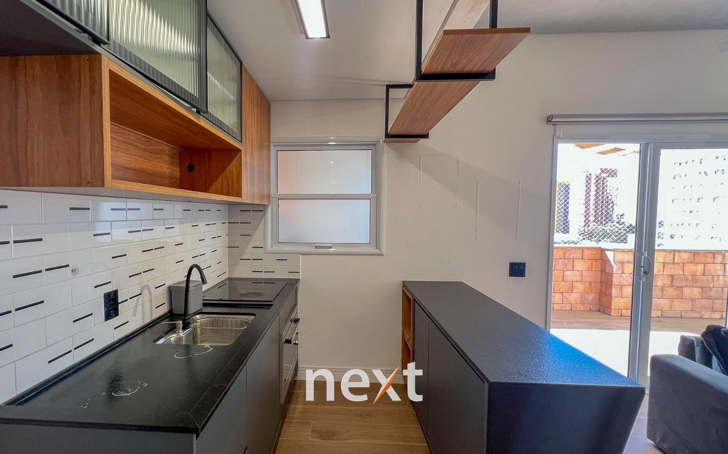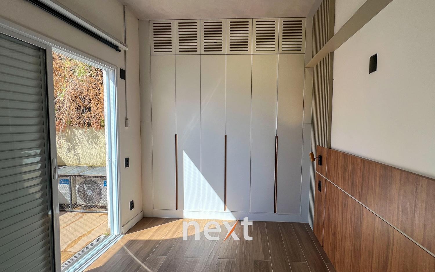 Sala de estar com sofá e ar condicionado, quarto com armários planejados e cozinha com forno e cooktop. Sacada estendida e espaço para móveis externos.