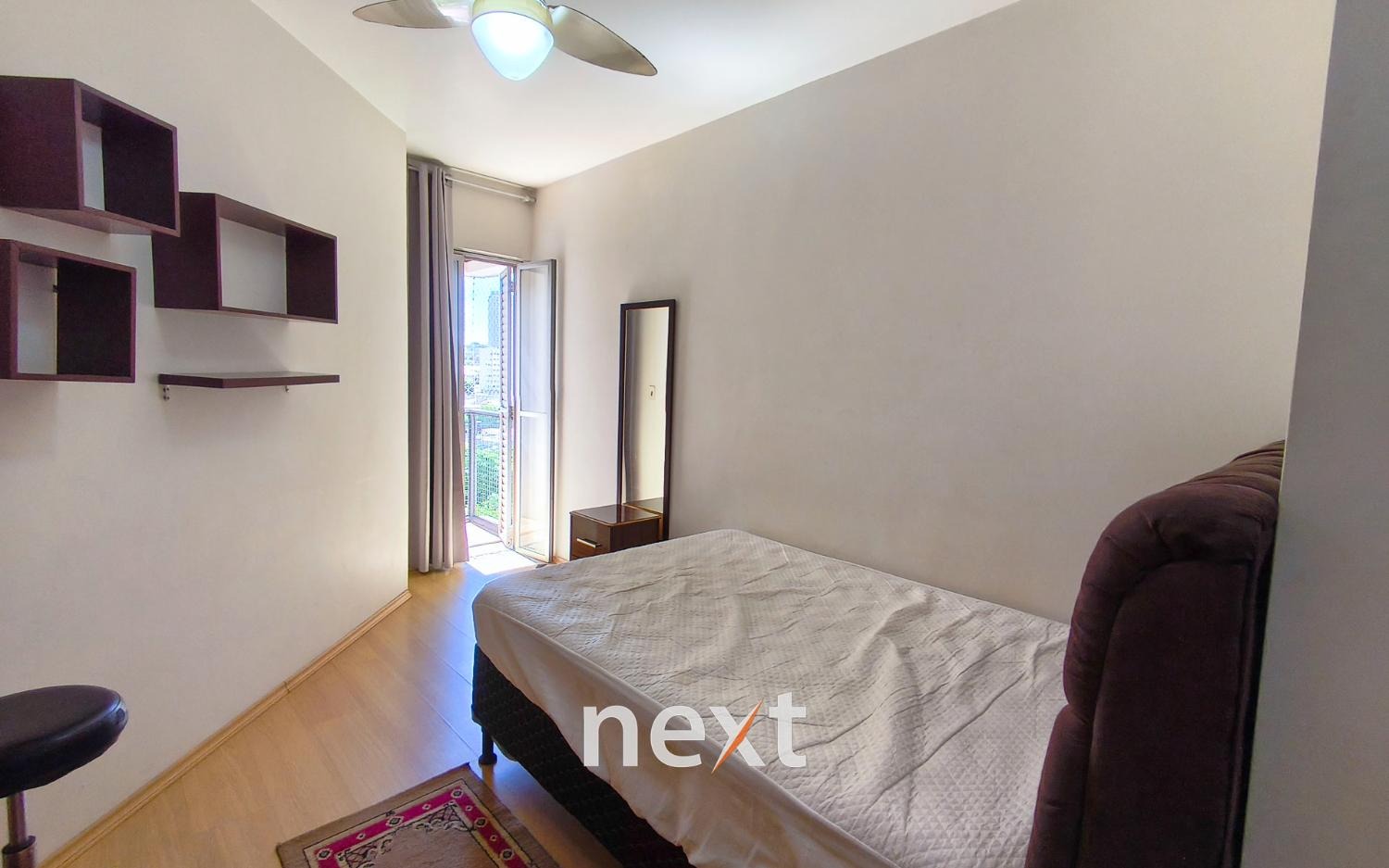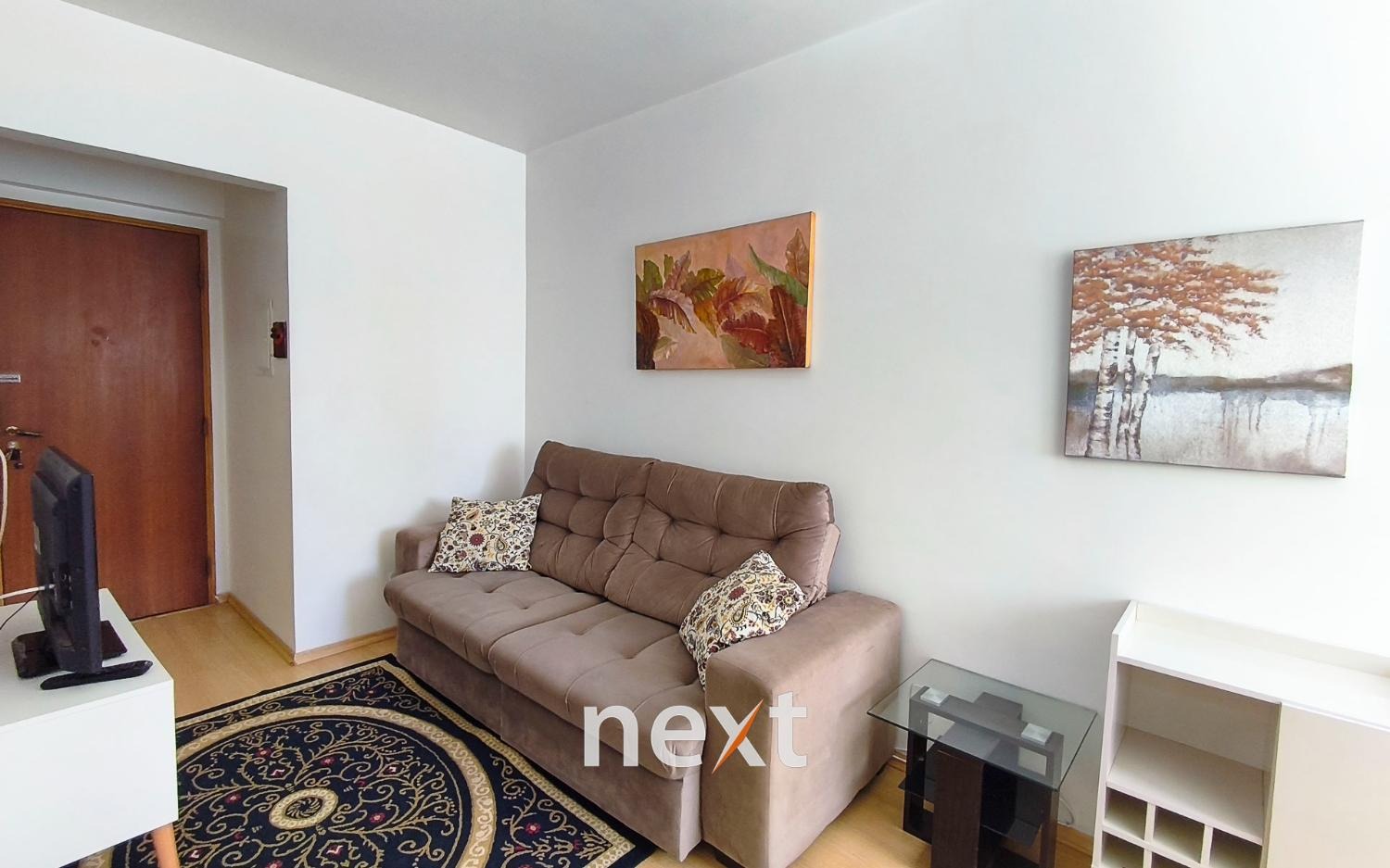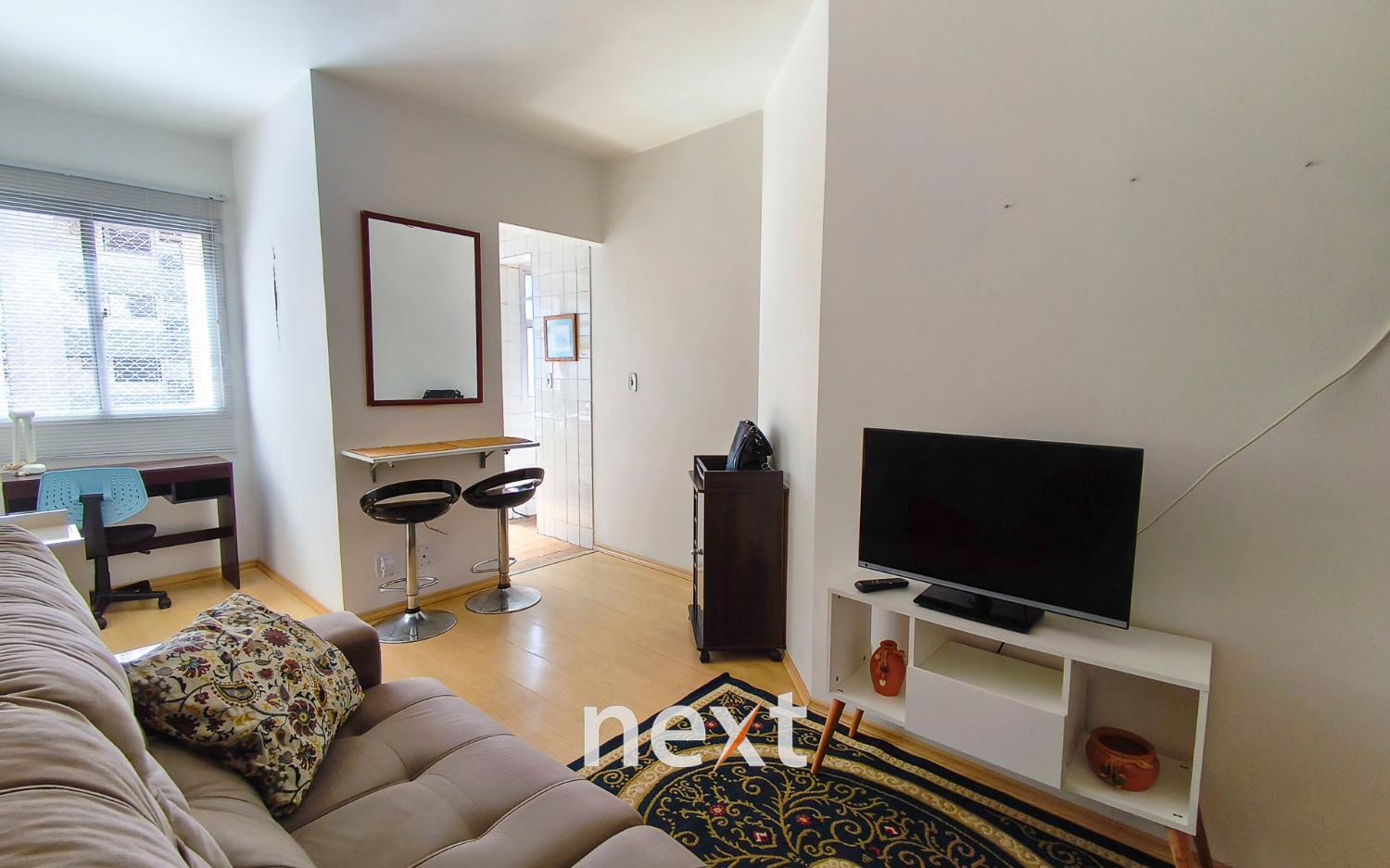 Ambientes com carpete de madeira na sala e no quarto, proporcionando conforto e elegância.
