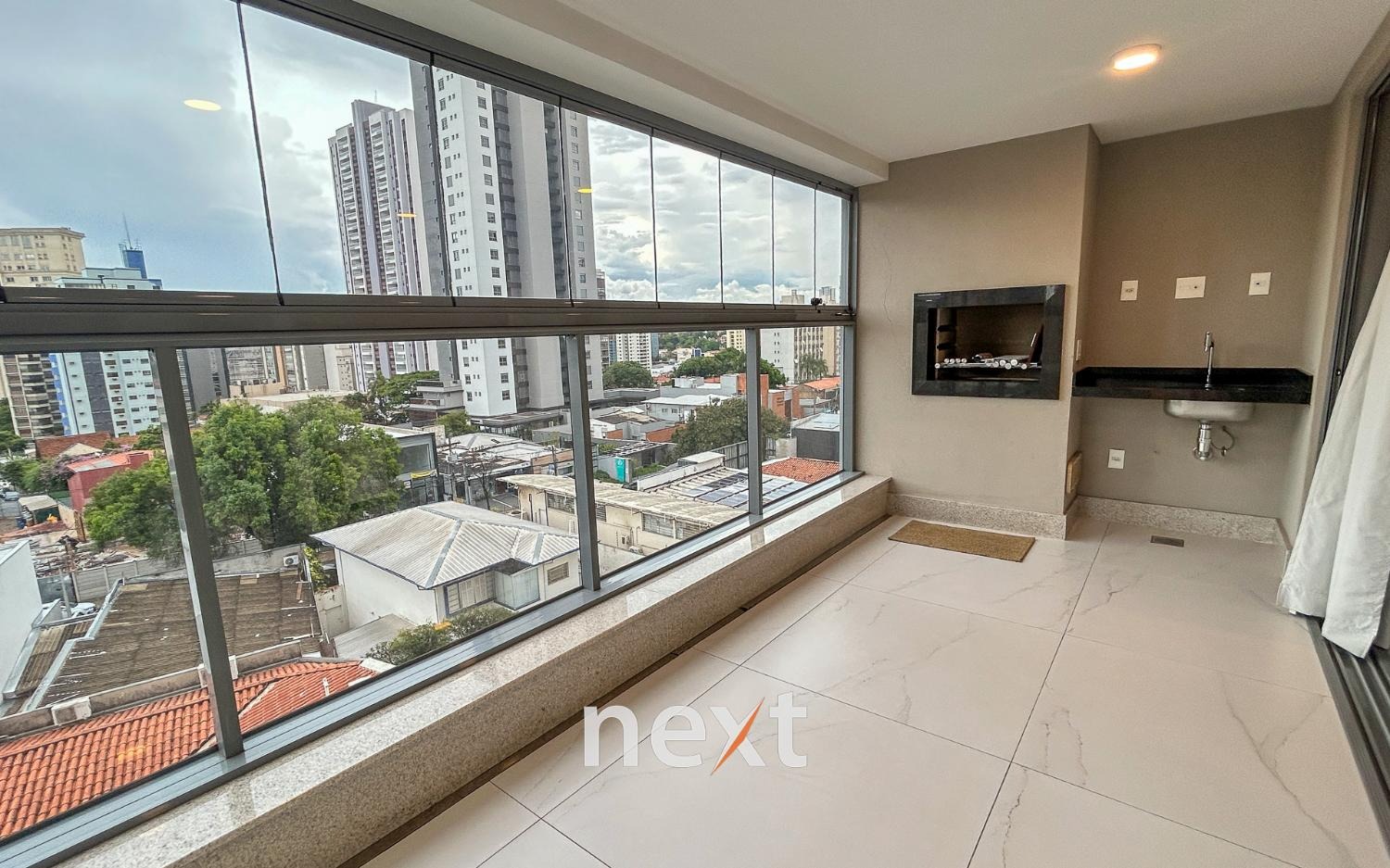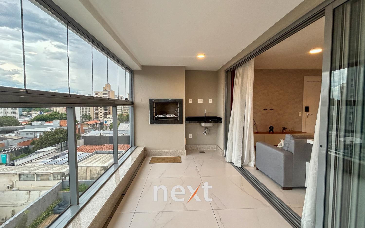 Varanda gourmet fechada, com churrasqueira, pia e acabamento premium