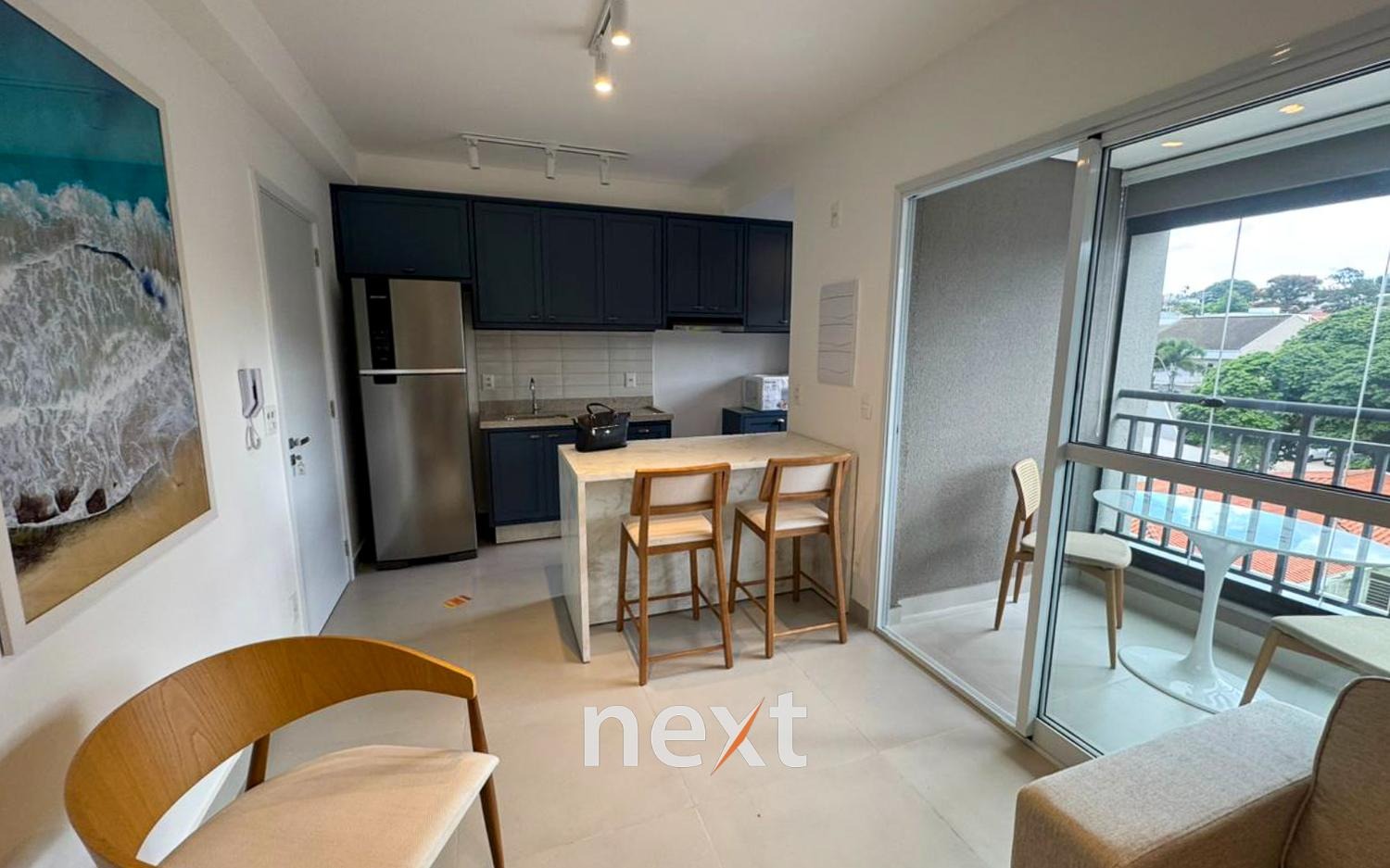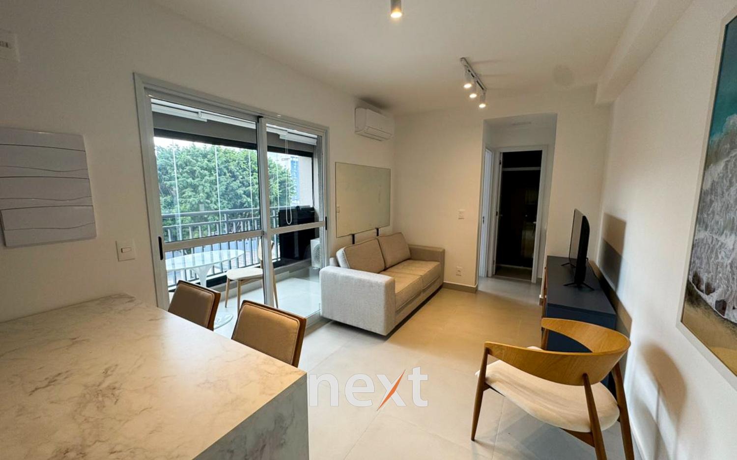 Primeira locação, sala com ar condicionado, cozinha americana planejada, área de serviço com lava e seca, sacada fechada com blindes e persianas, dormitório com cama e armários, banheiro completo, 1 vaga de garagem, coberta.
