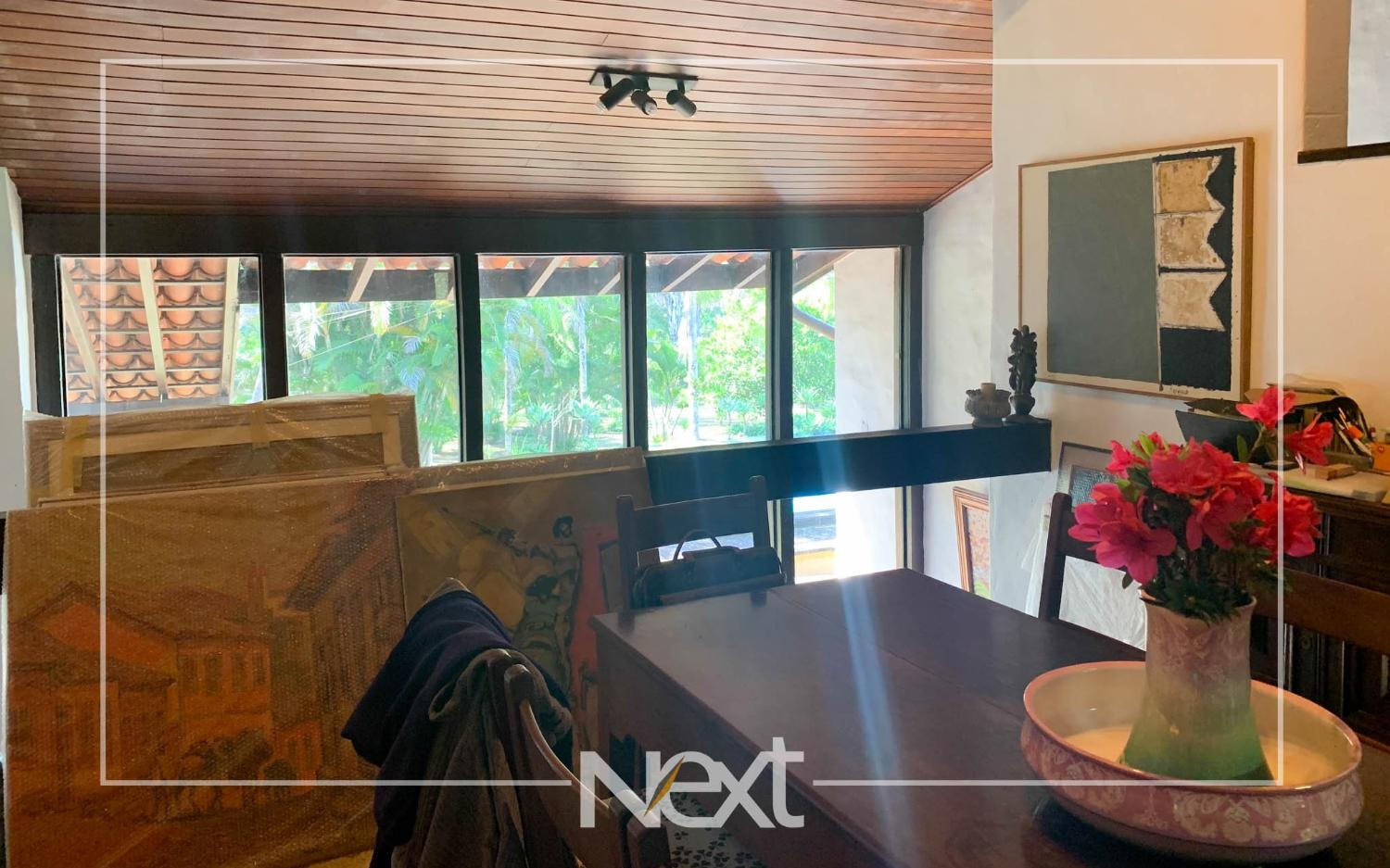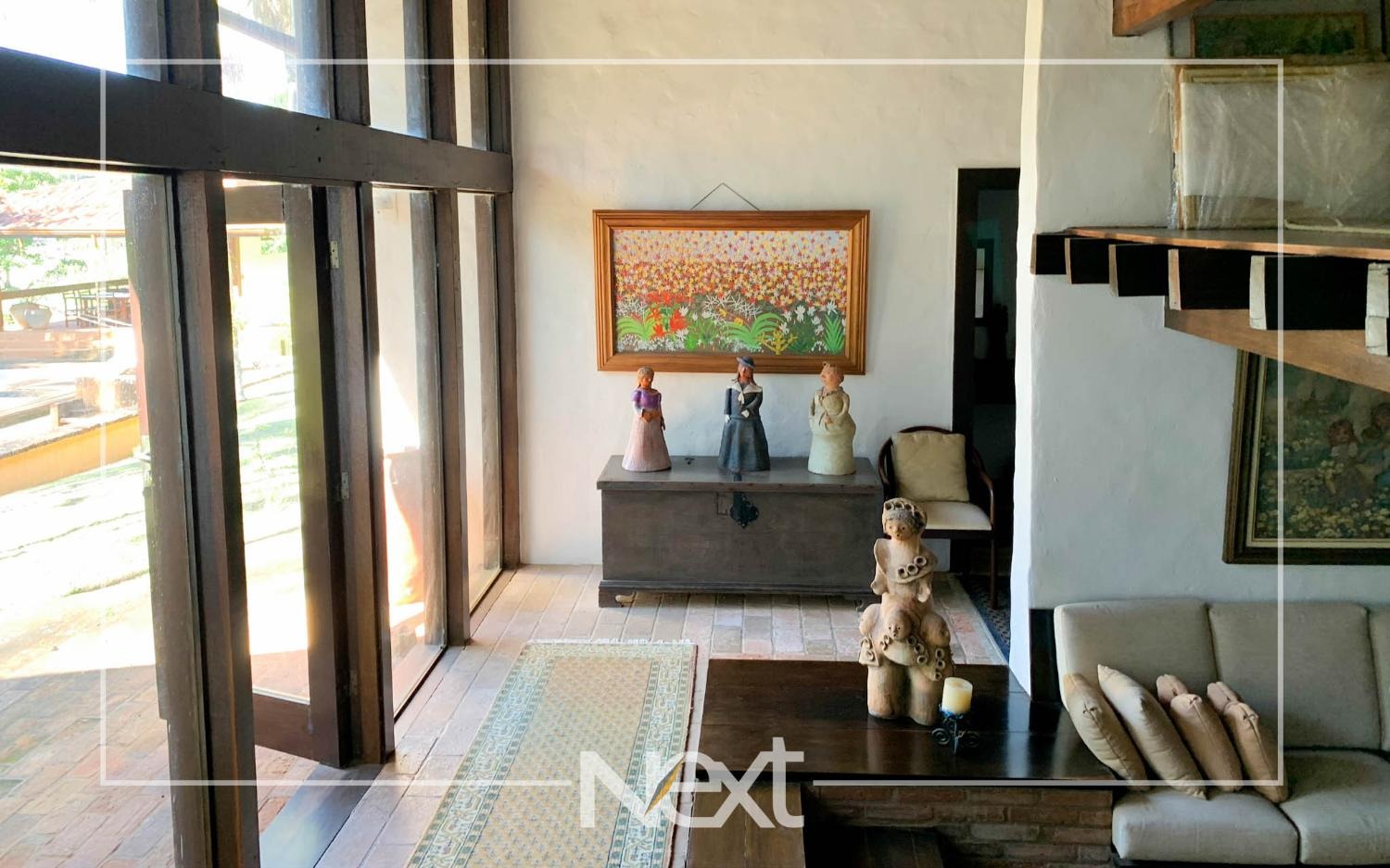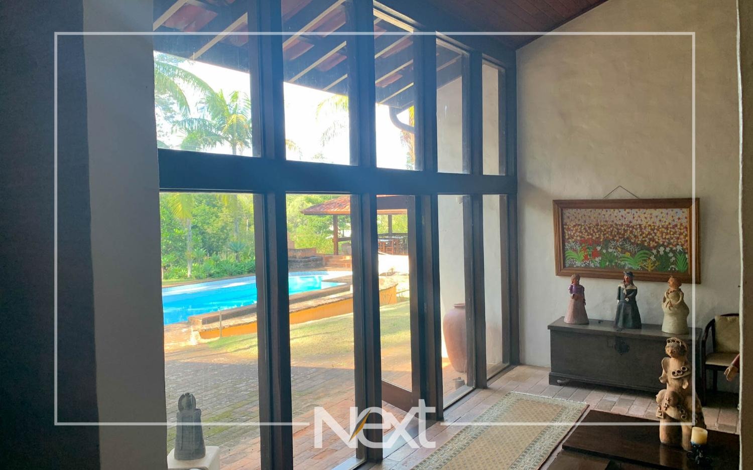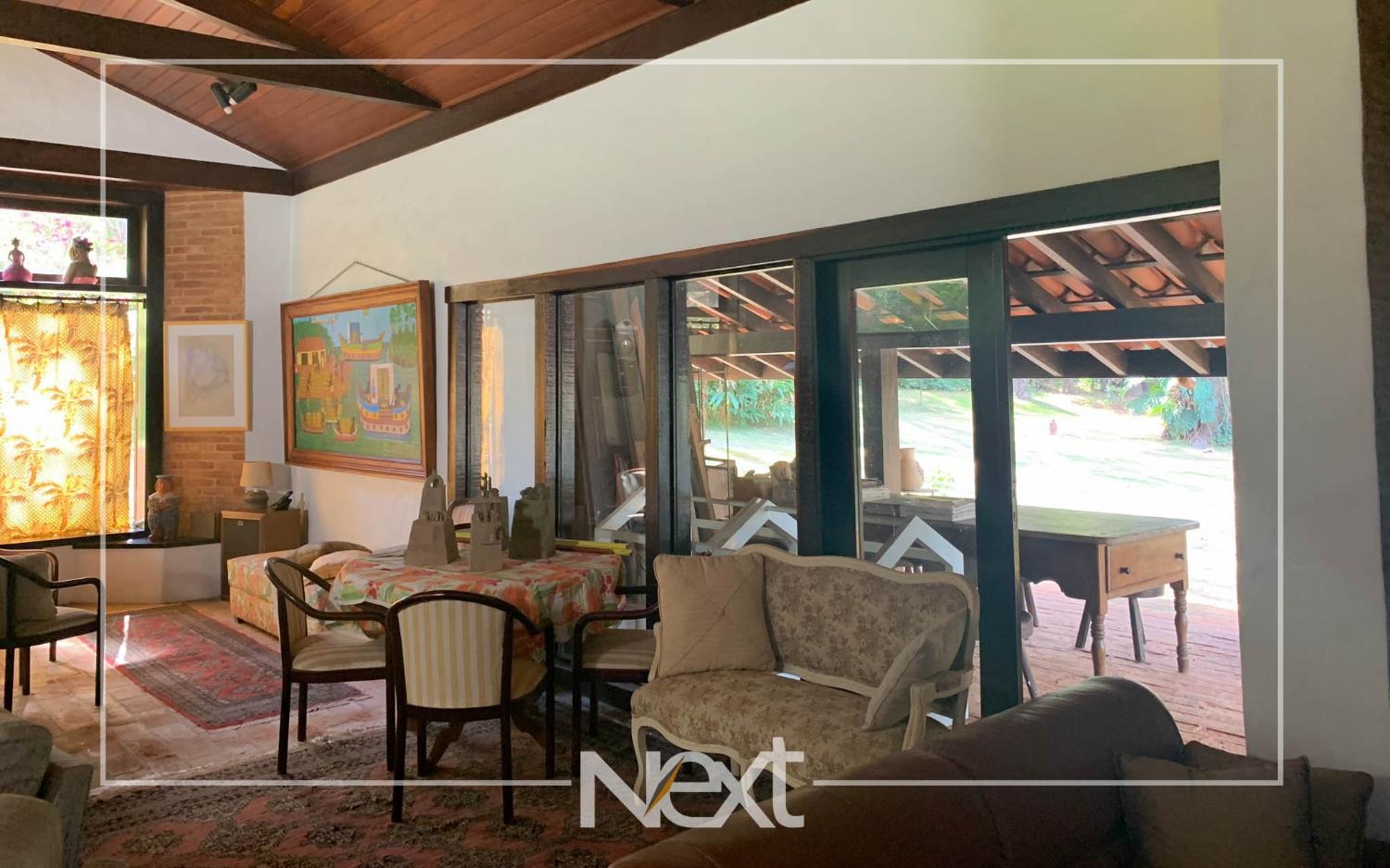 Casa bem iluminada com grandes janelas e portas.