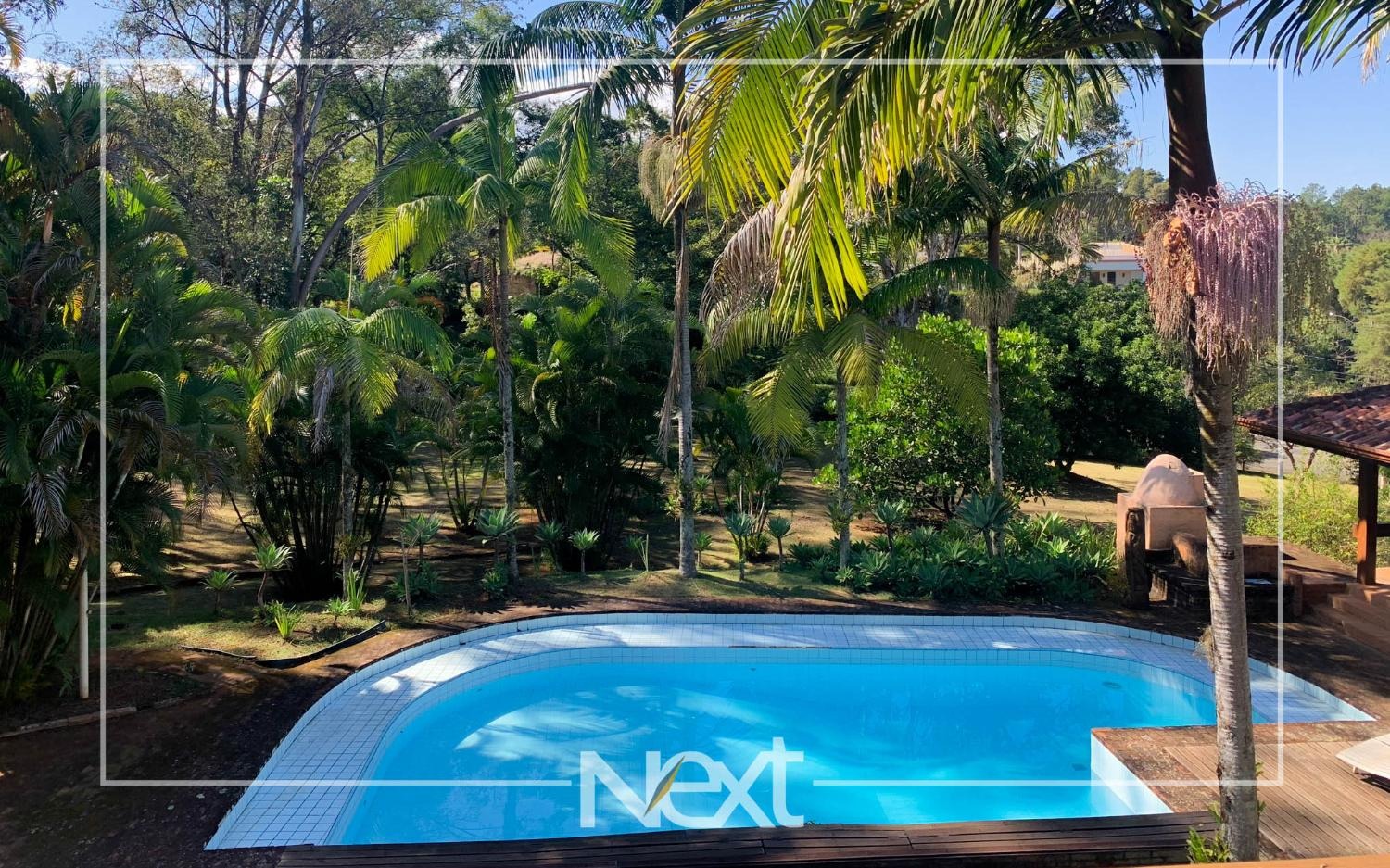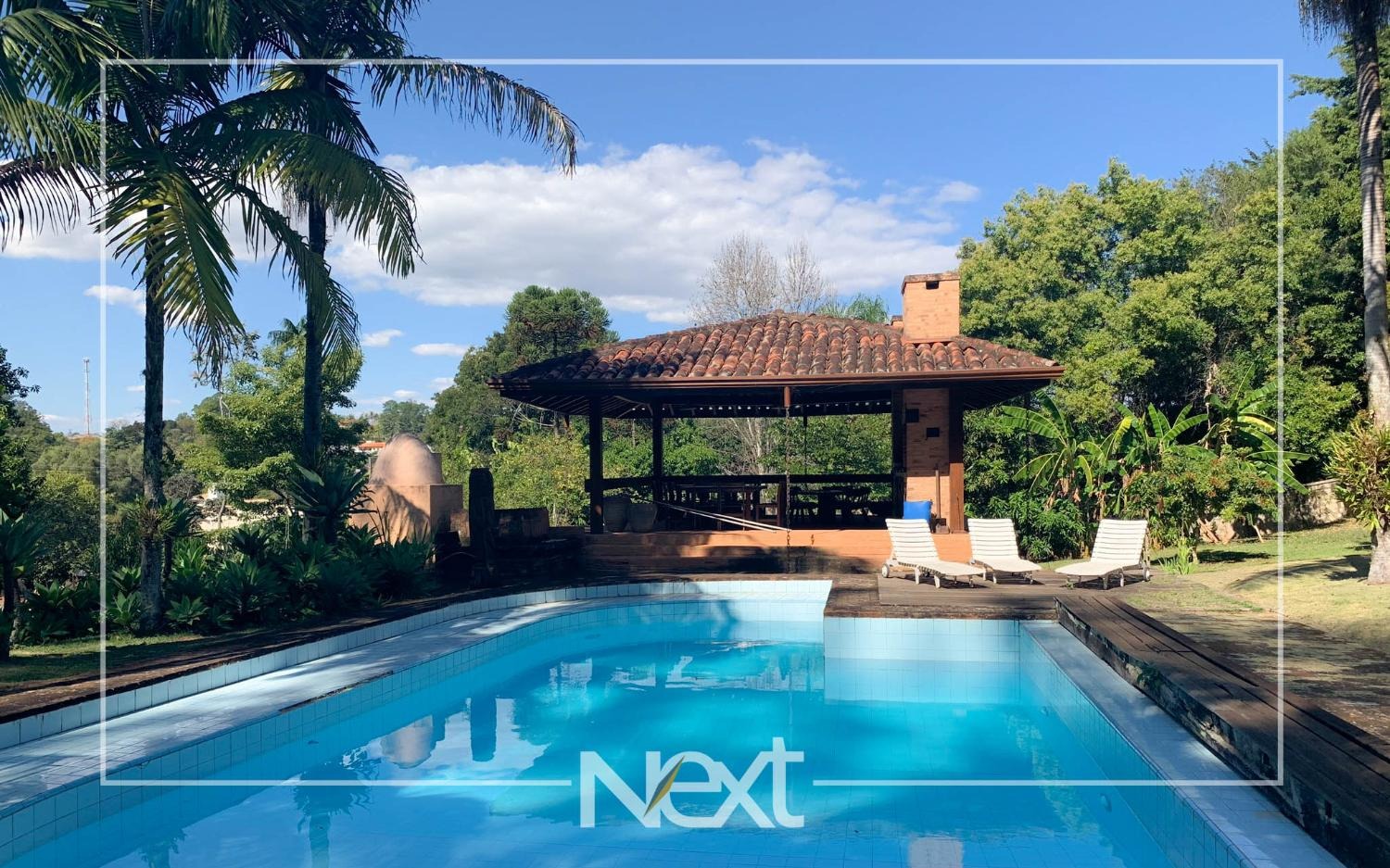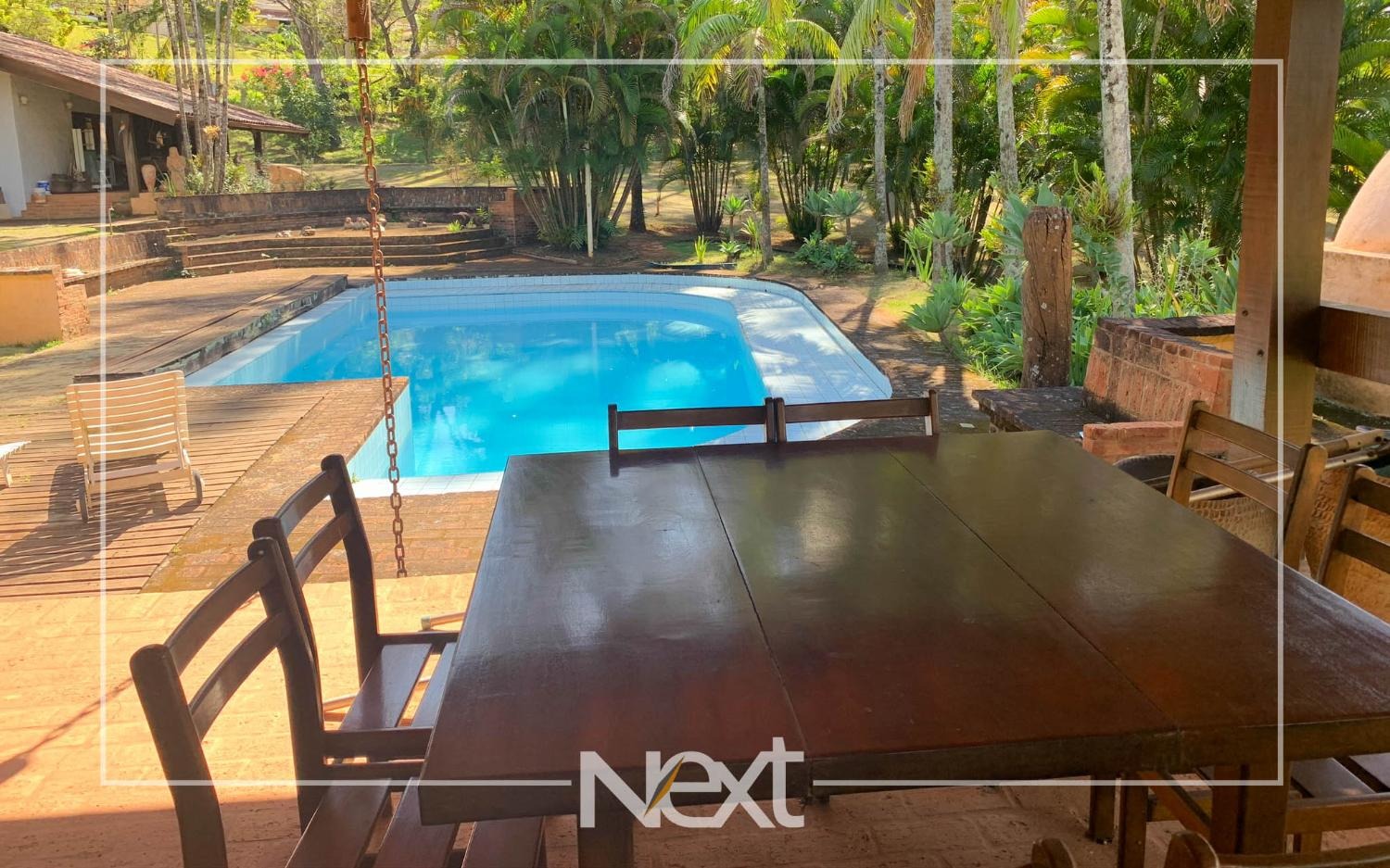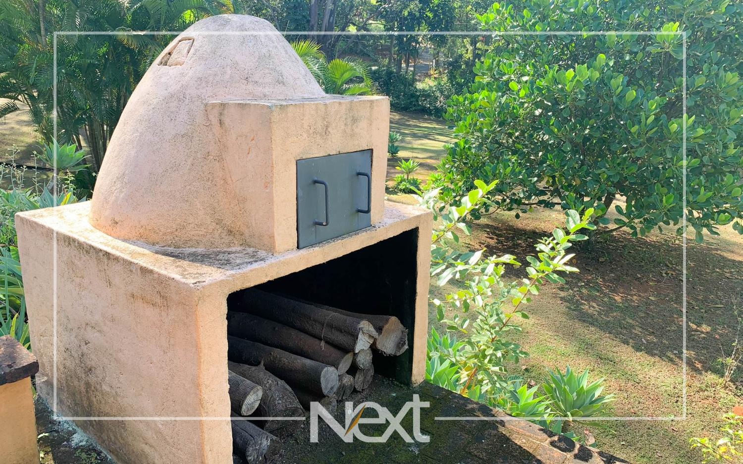 Lindo jardim com piscina, com banheiros, depósito, churrasqueira, forno a lenha, forno de pizza.