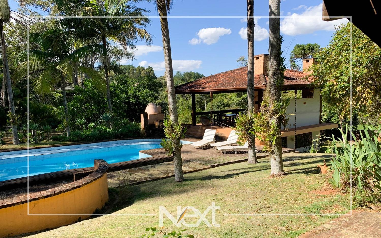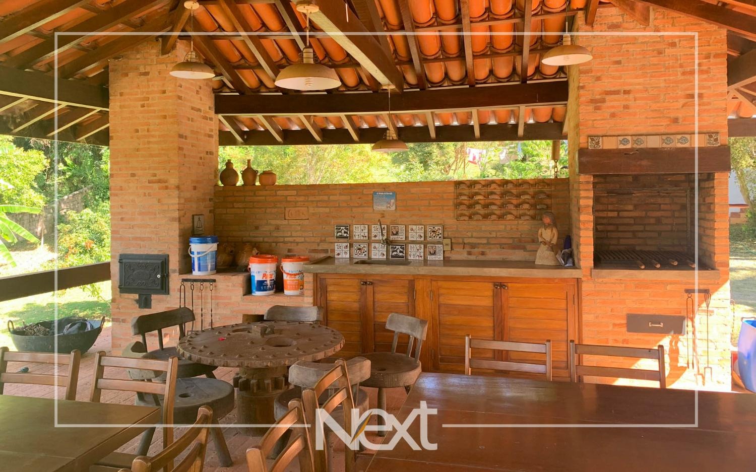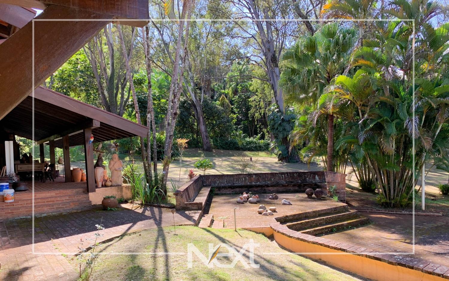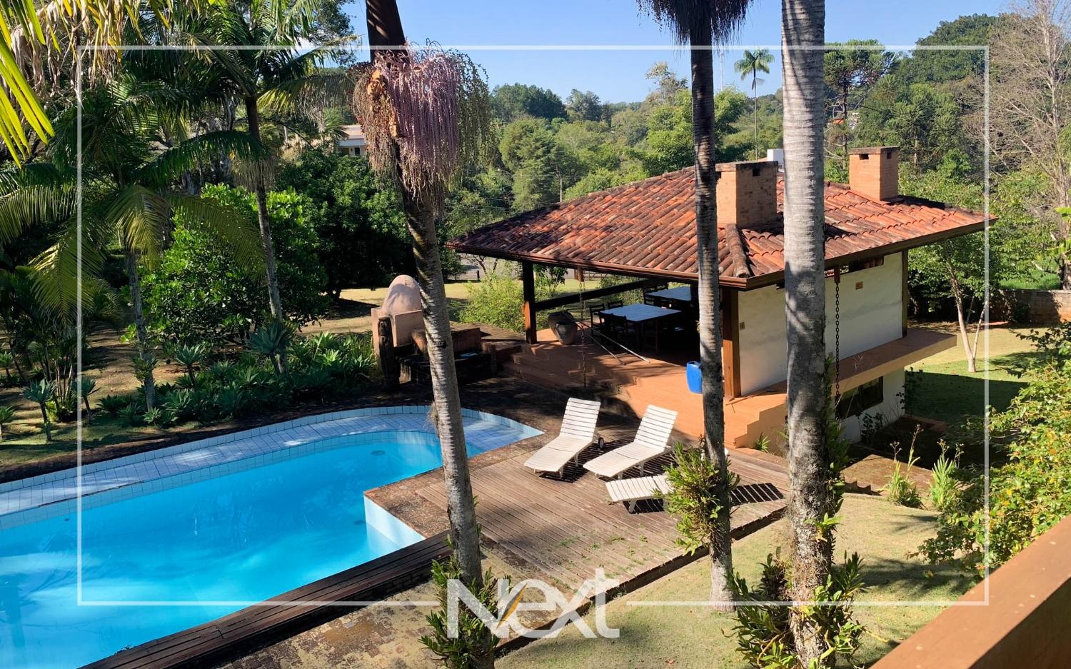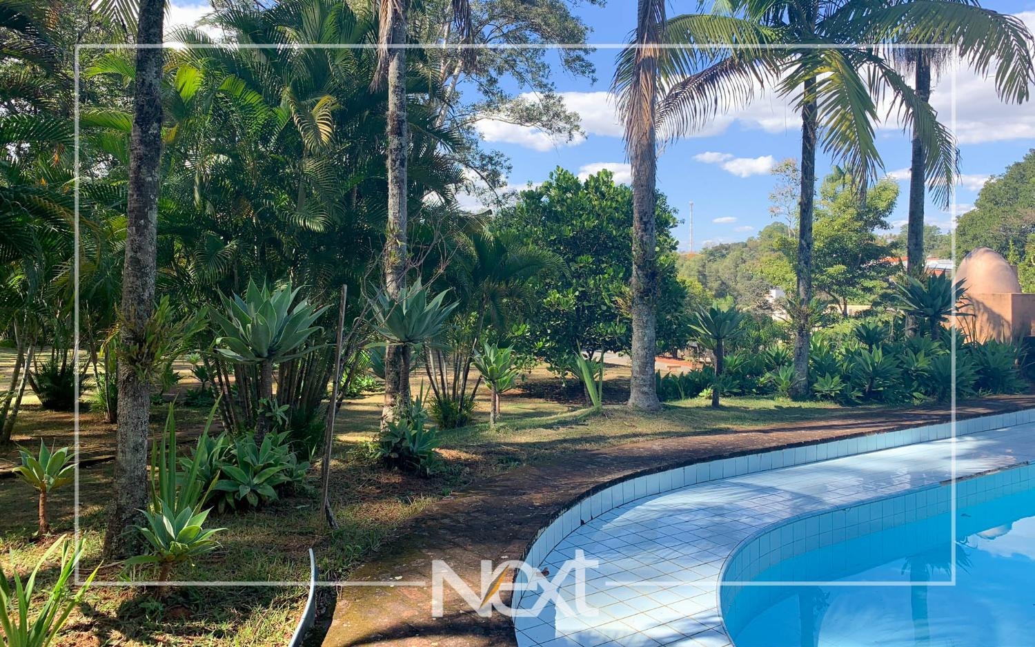 Lindo jardim com piscina, com banheiros, depósito, churrasqueira, forno a lenha, forno de pizza.