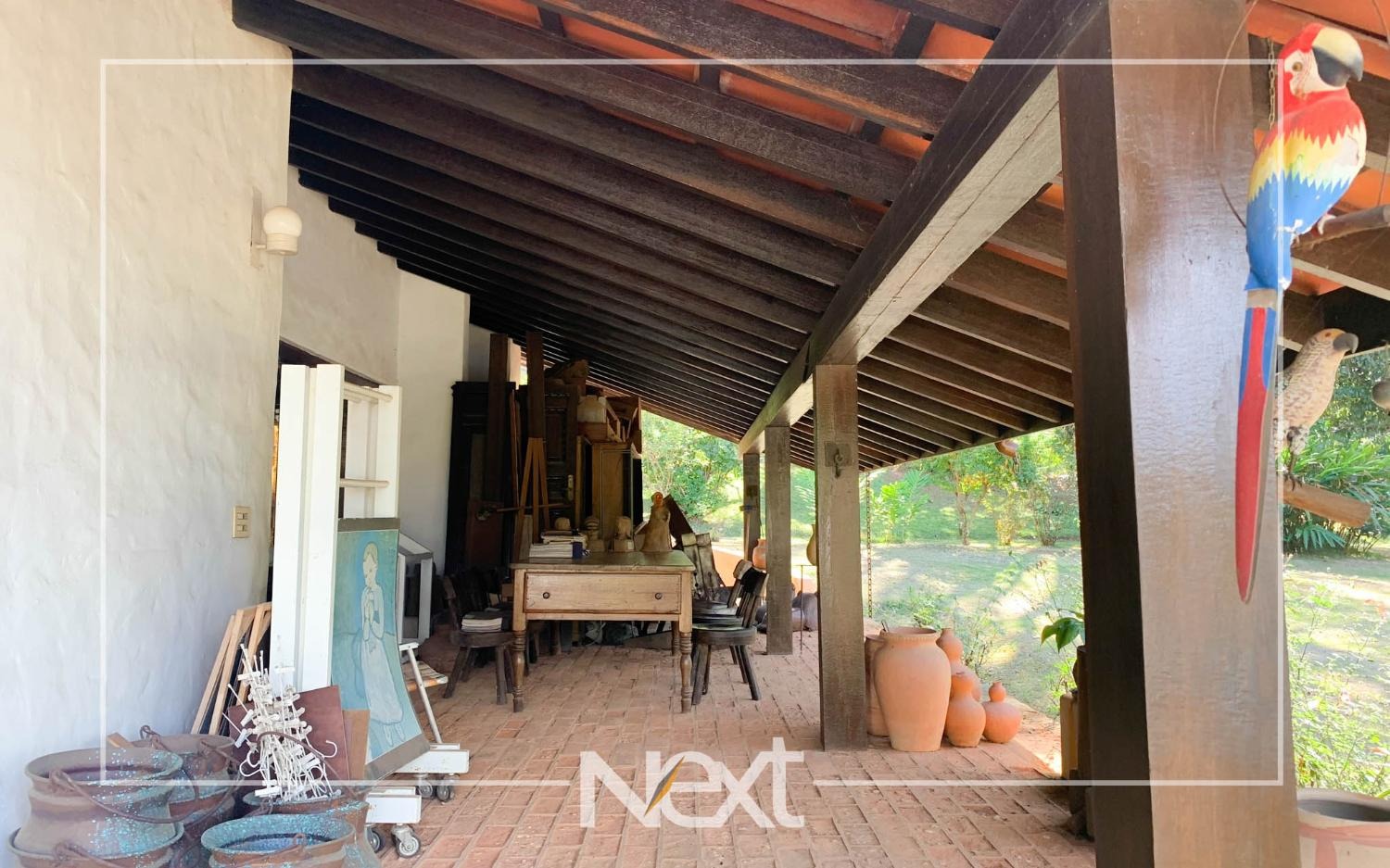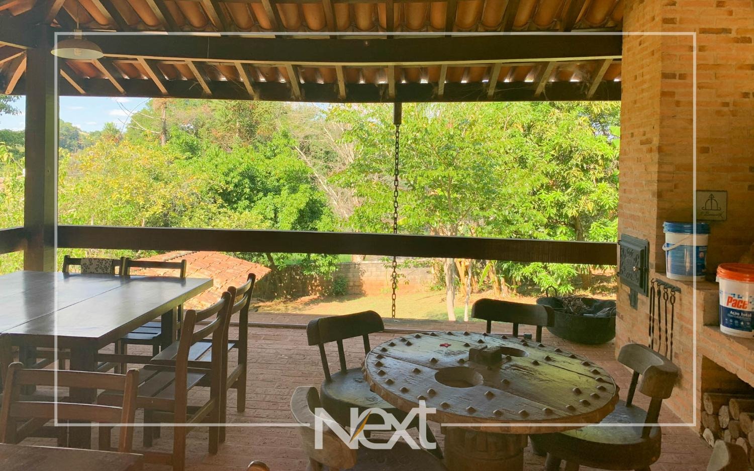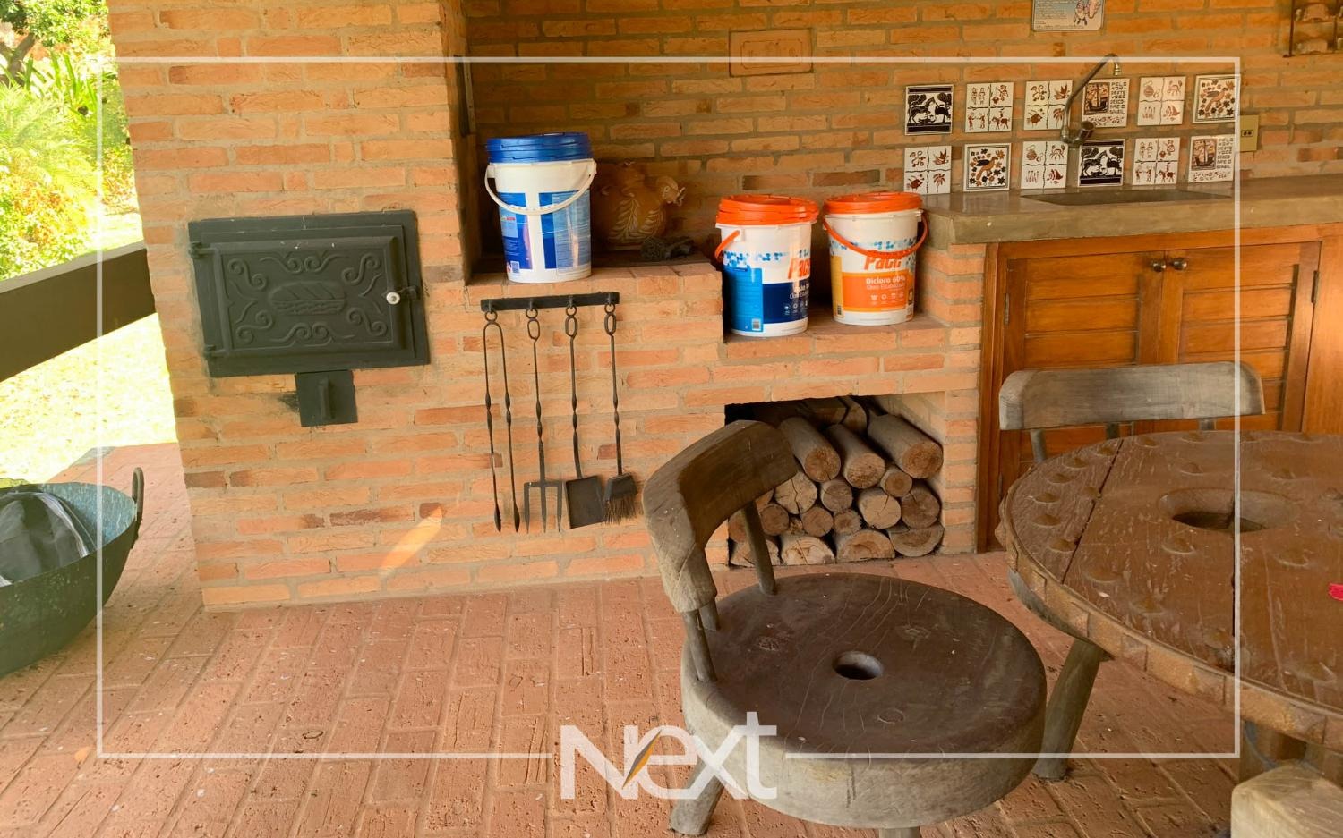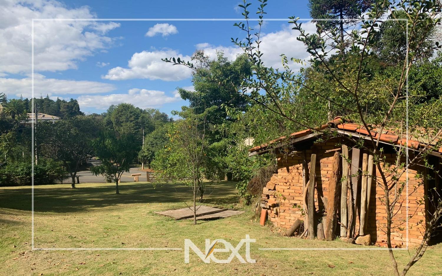 Lindo jardim com piscina, com banheiros, depósito, churrasqueira, forno a lenha, forno de pizza.