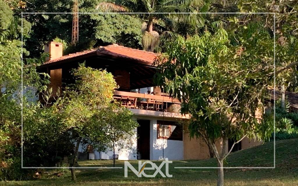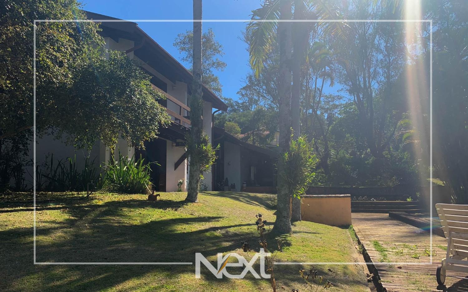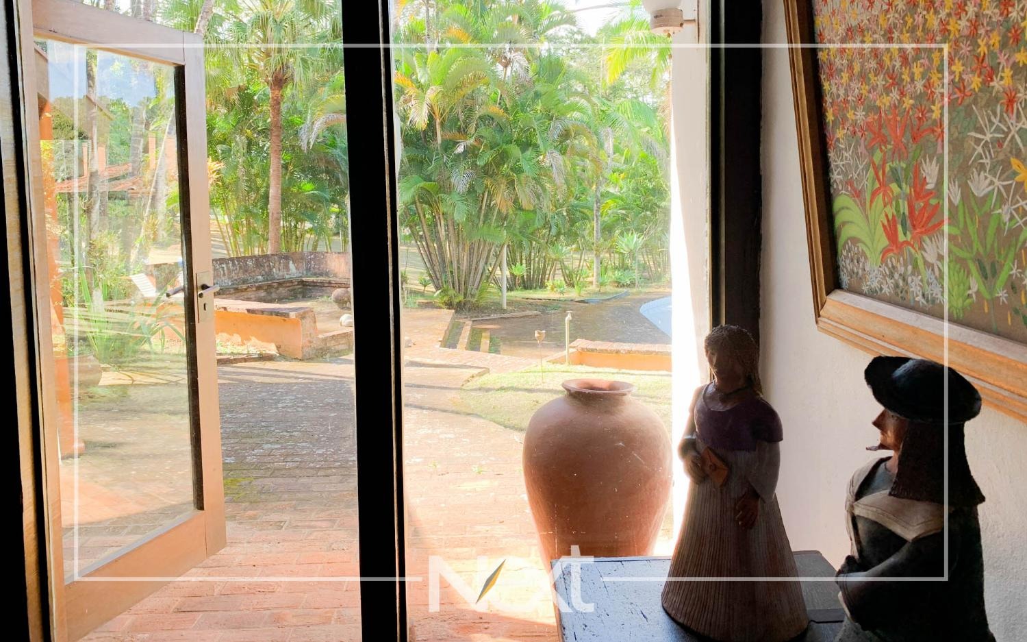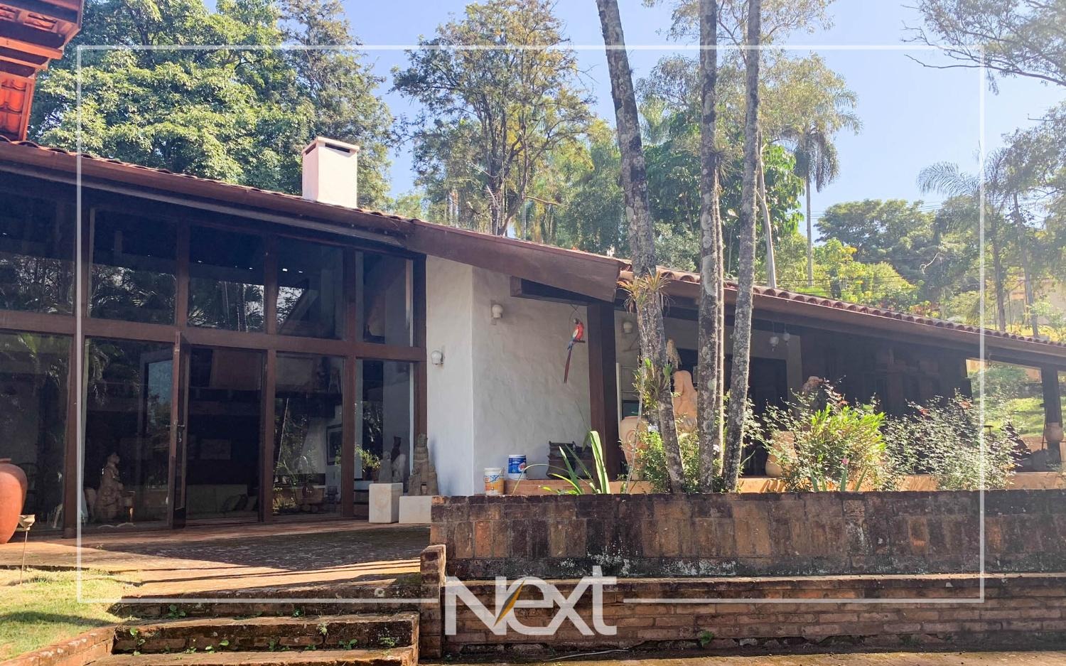 Nivel inferior suite com varanda, escritório e sala de estar, tv, lavabo e aconchegante lareira, todas com acesso ao terraço e jardim com piscina, gramado e belas árvores.