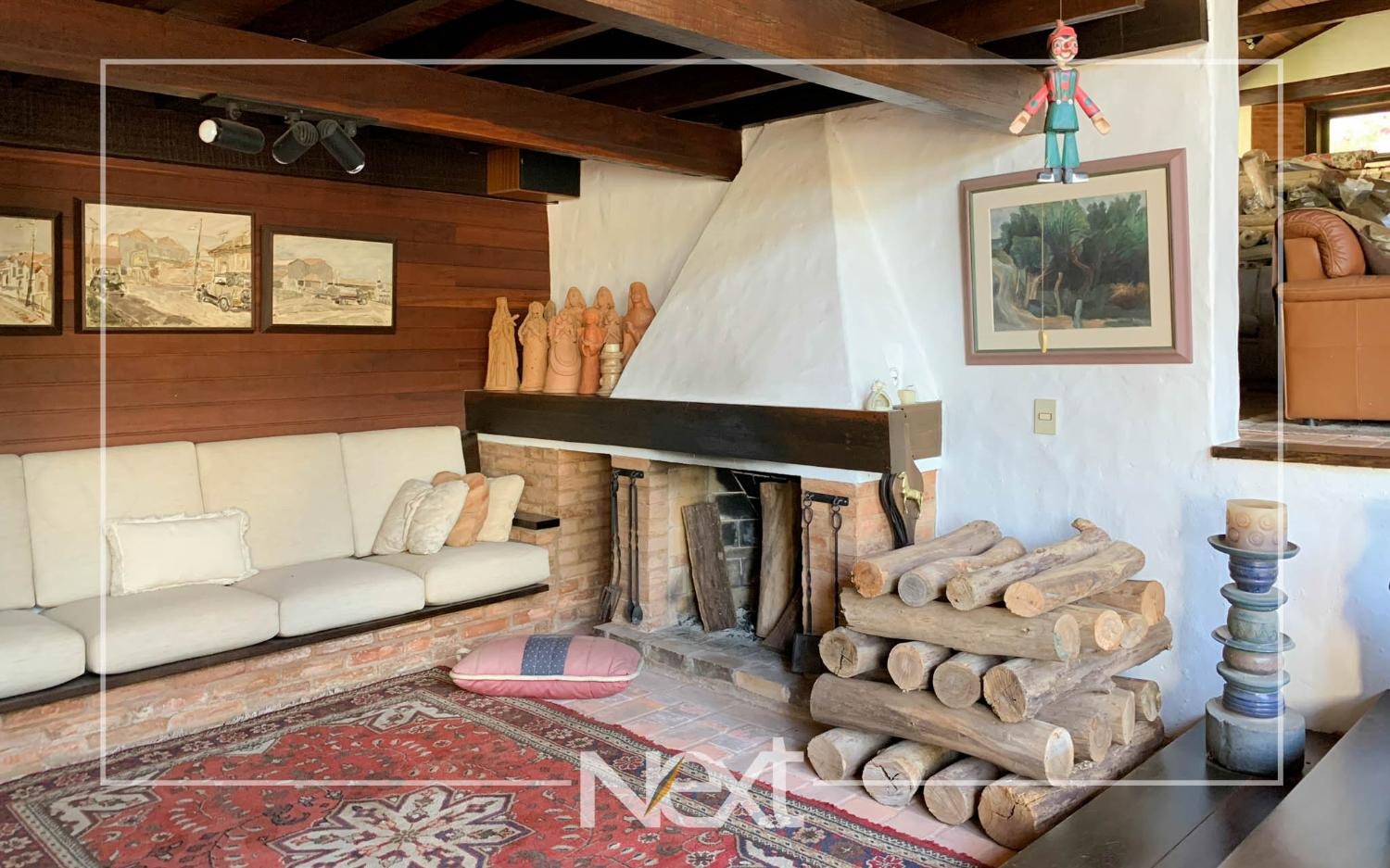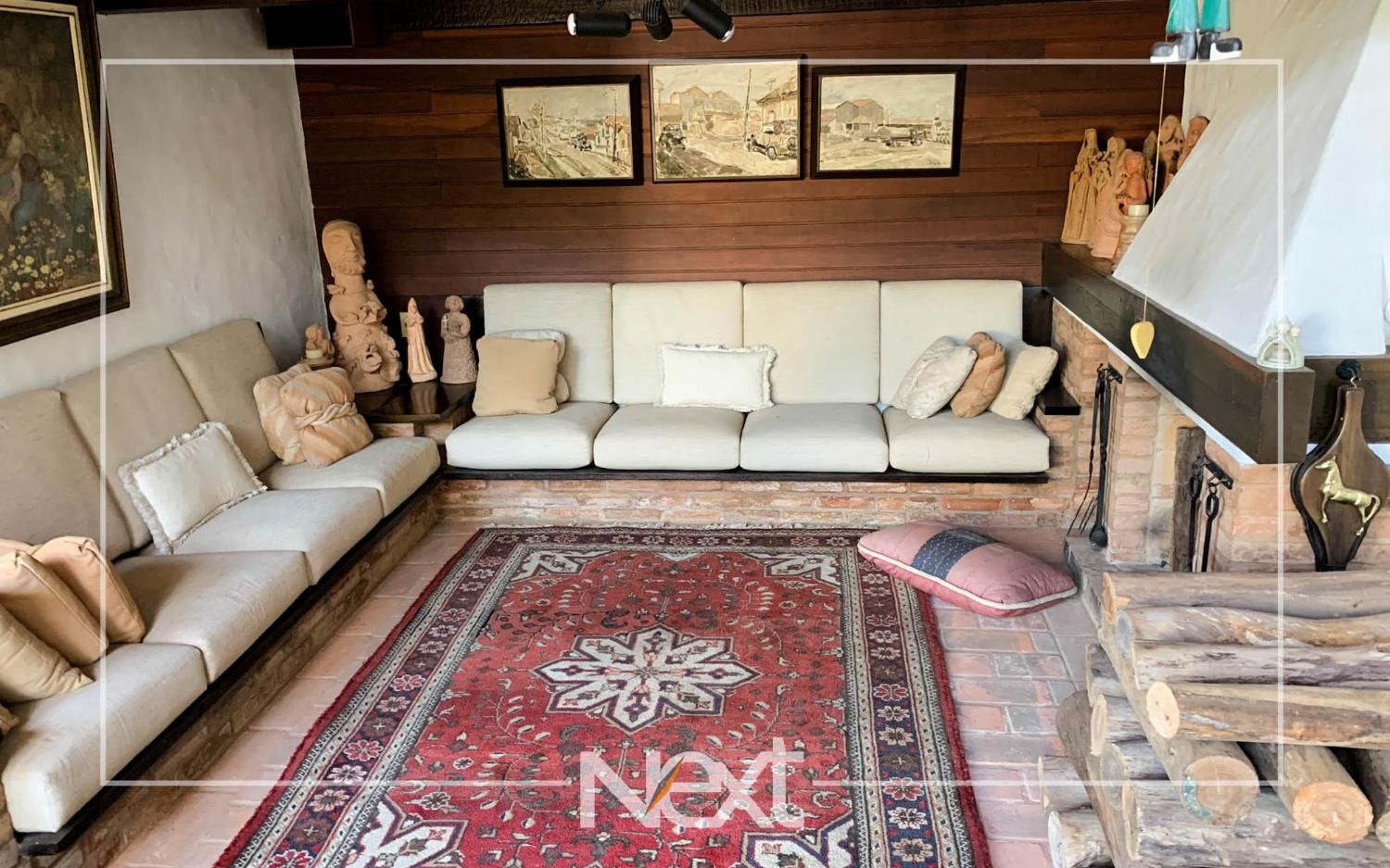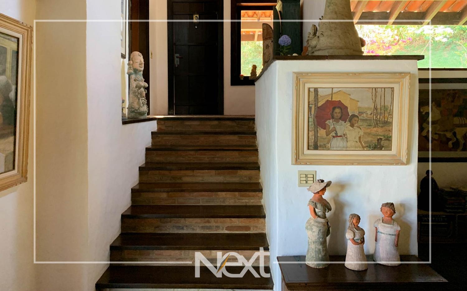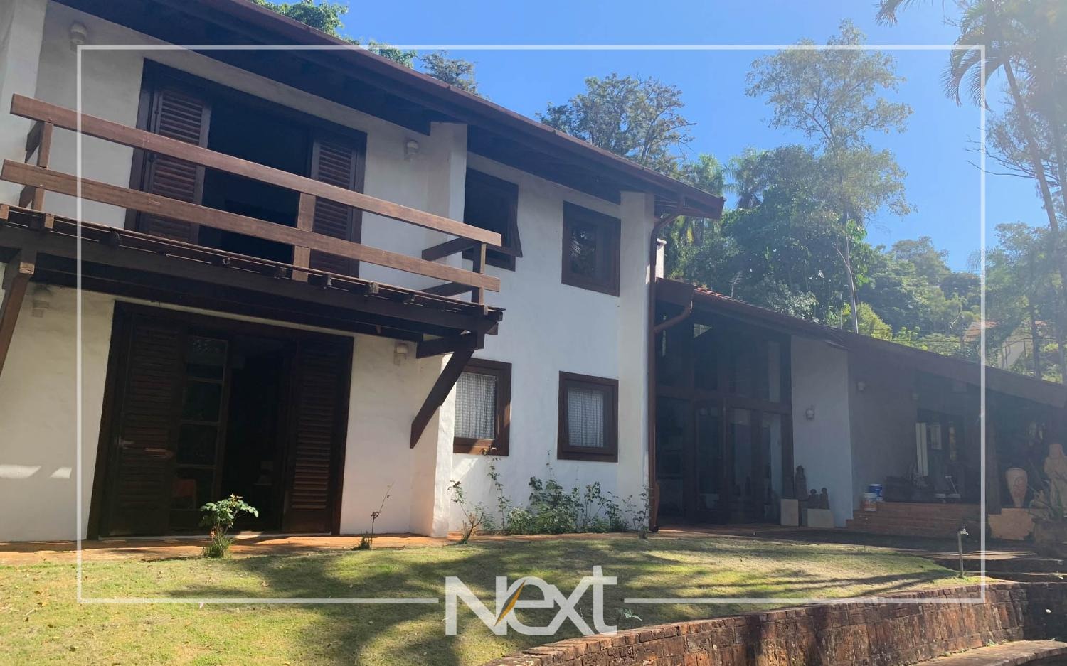 Nivel inferior suite com varanda, escritório e sala de estar, tv, lavabo e aconchegante lareira, todas com acesso ao terraço e jardim com piscina, gramado e belas árvores.