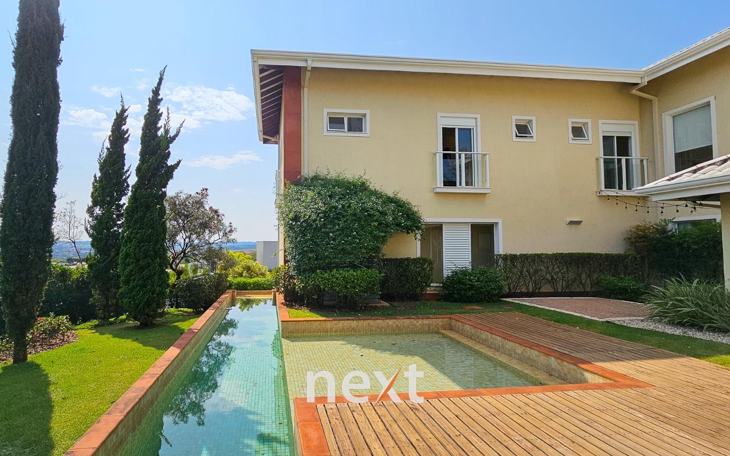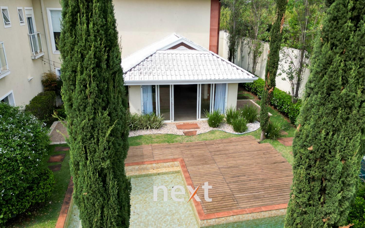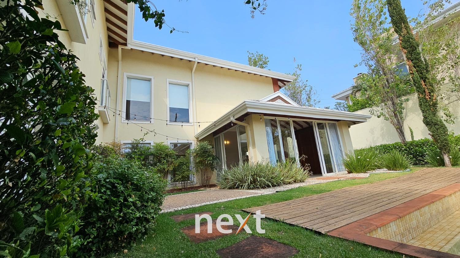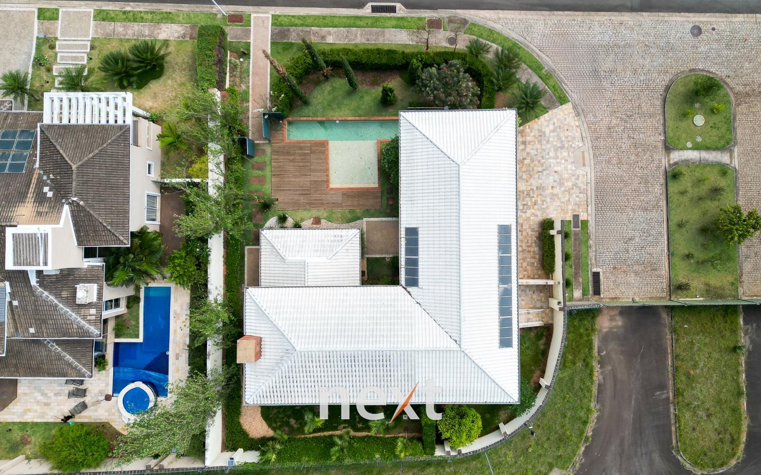A área externa da casa é um verdadeiro oásis, a piscina com raia de 13 metros para os amantes da natação e a prainha para as crianças aproveitarem os dias quentes.