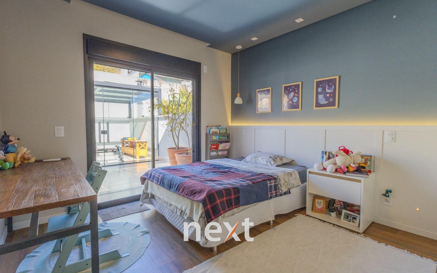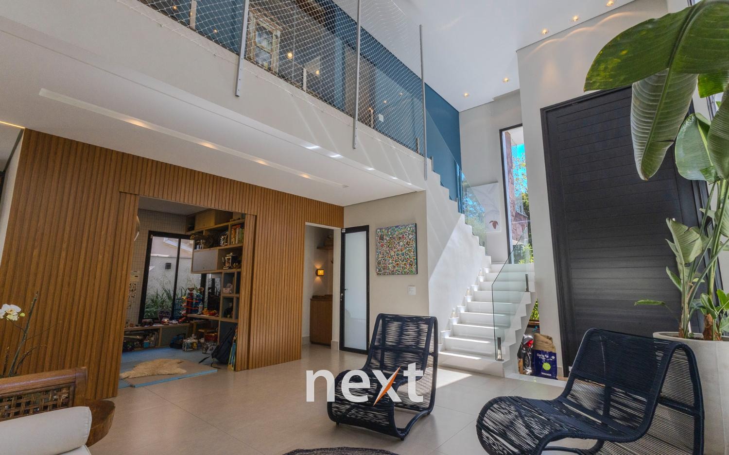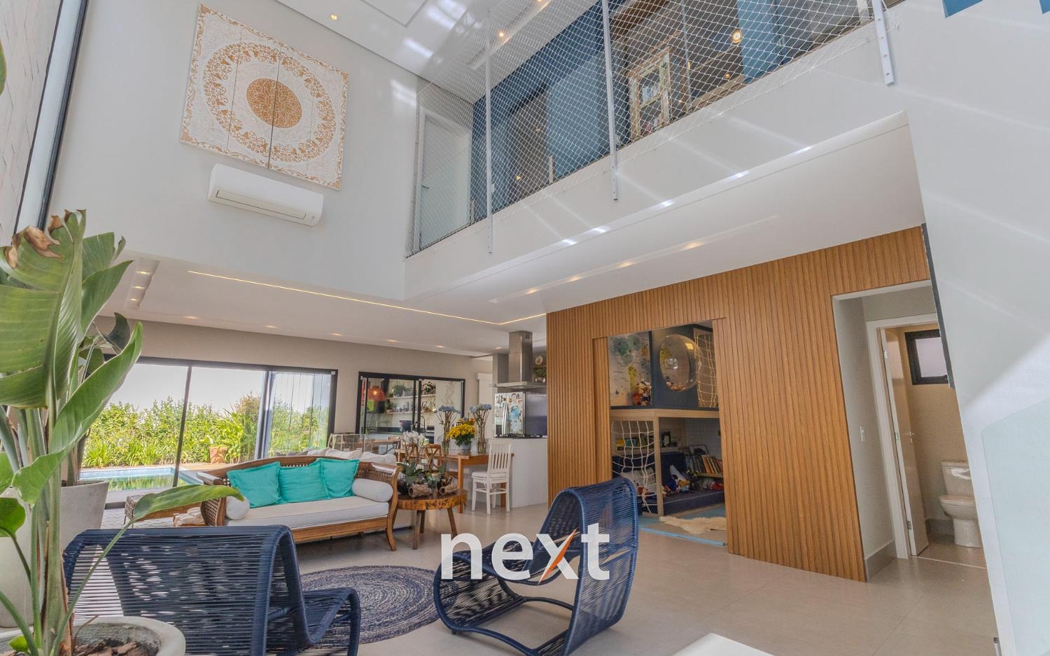 Imóvel possui hall de entrada, living para 02 ambientes, sendo sala de estar com lareira sala de jantar integrada, lavabo, dormitório ou escritório reversível no térreo (convertido em brinquedoteca), cozinha americana com despensa e lavanderia.