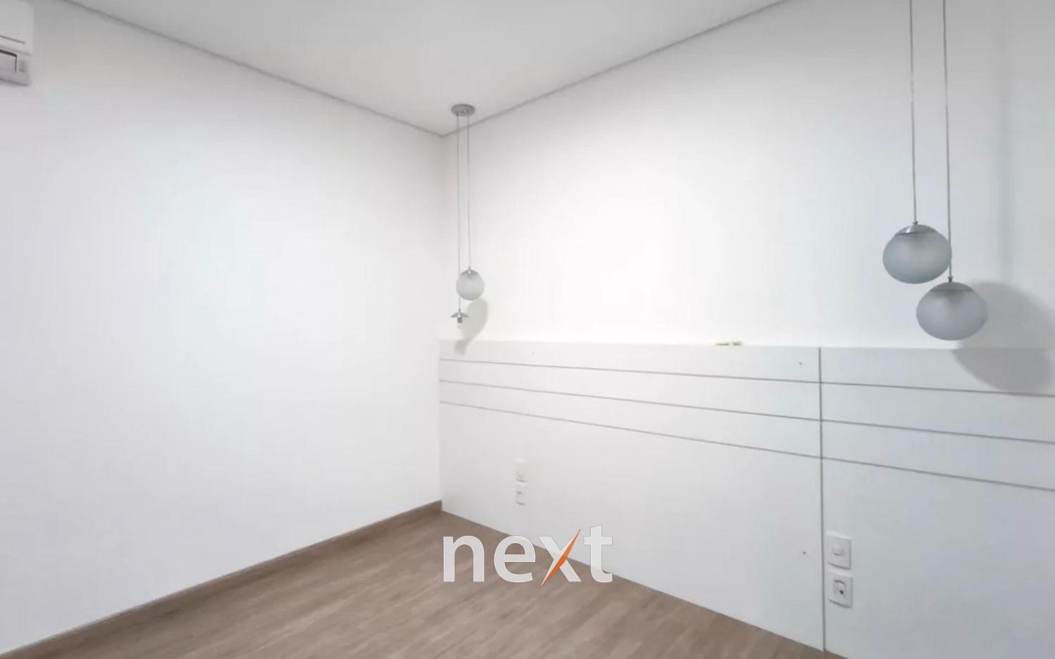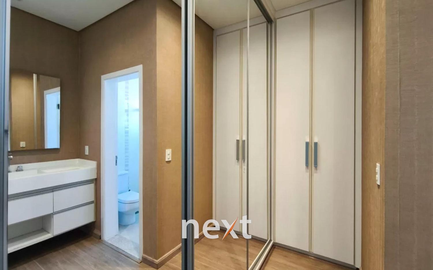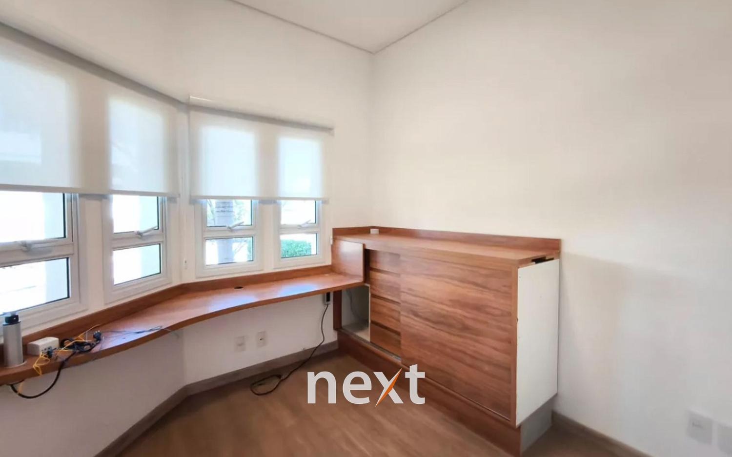 Sobrado no Swiss Park, Campinas, com 3 dormitórios no piso superior, sendo uma suíte máster com closet e dois quartos comuns. Todos os quartos possuem armários planejados, ar-condicionado split e persianas automatizadas. Há um banheiro social e um espaço adicional que pode ser revertido em quarto.