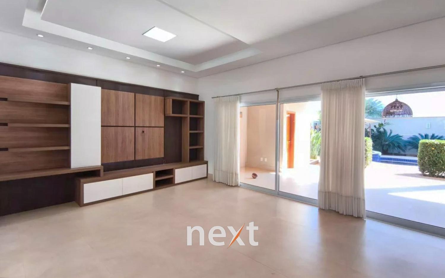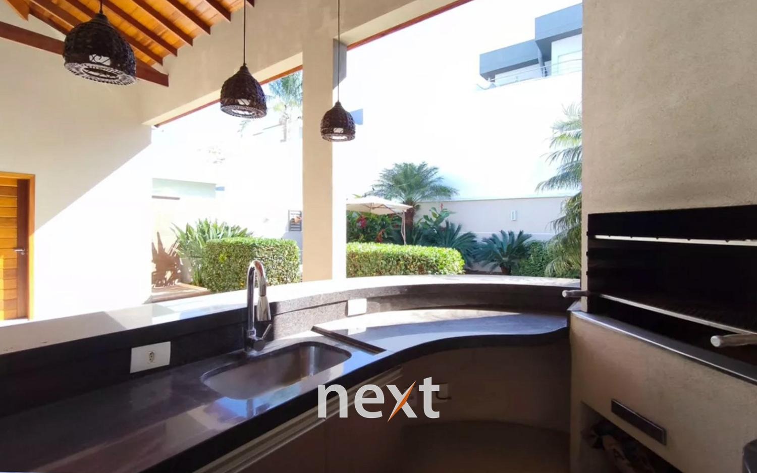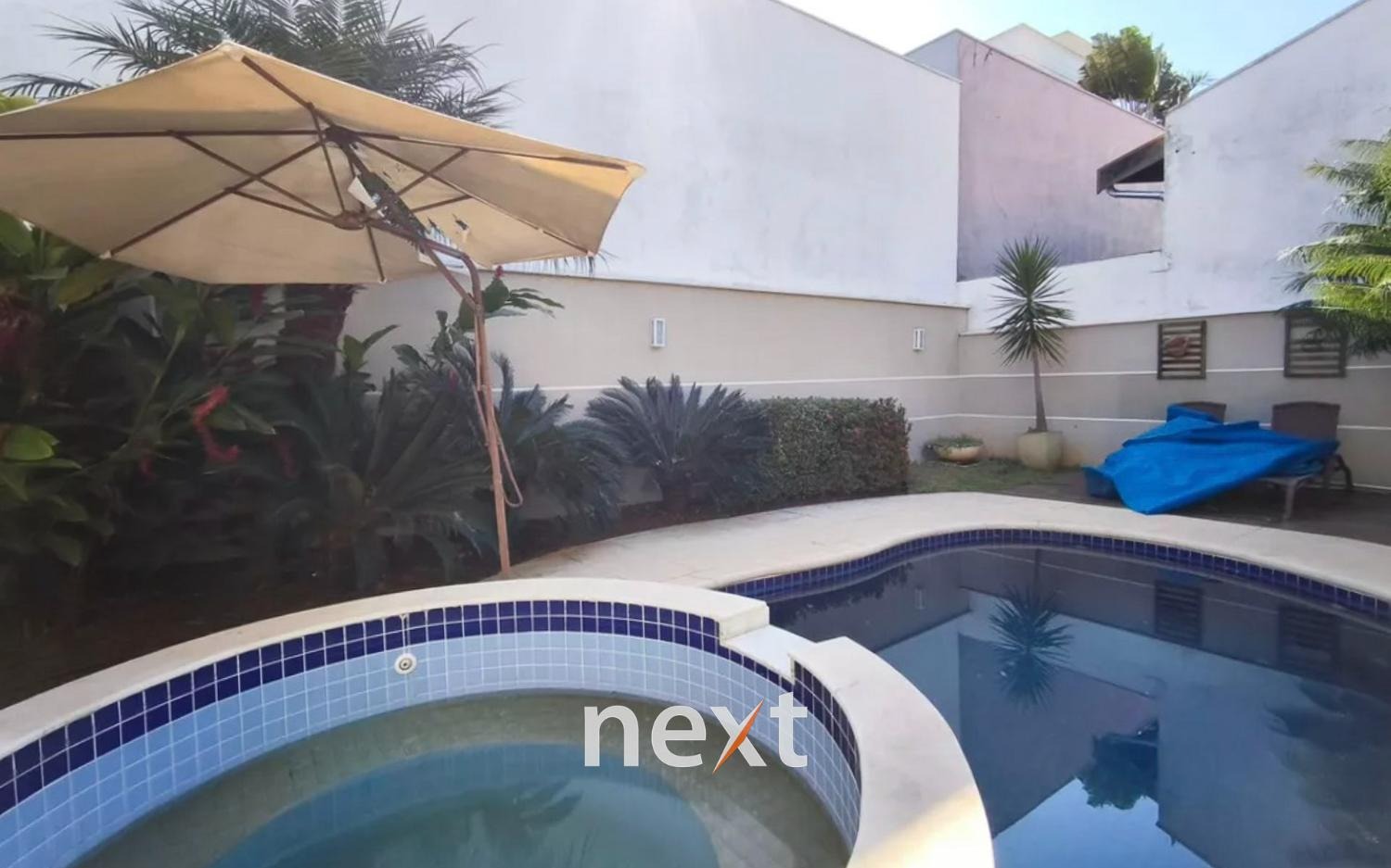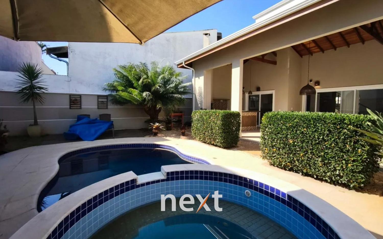 A área externa oferece piscina com hidromassagem, churrasqueira e uma ampla varanda. A sala possui dois ambientes, a cozinha é planejada e há uma área de serviço. Garagem coberta para dois carros.