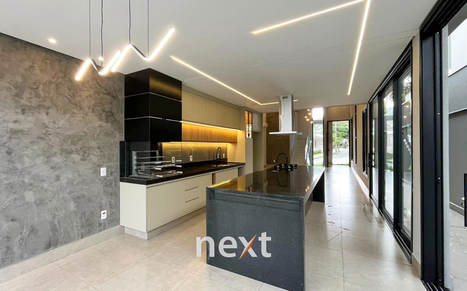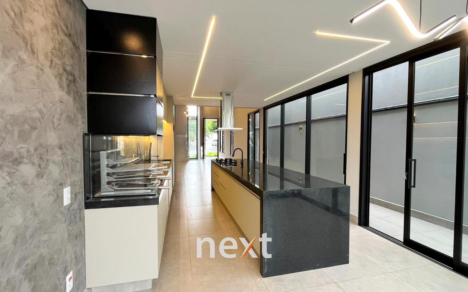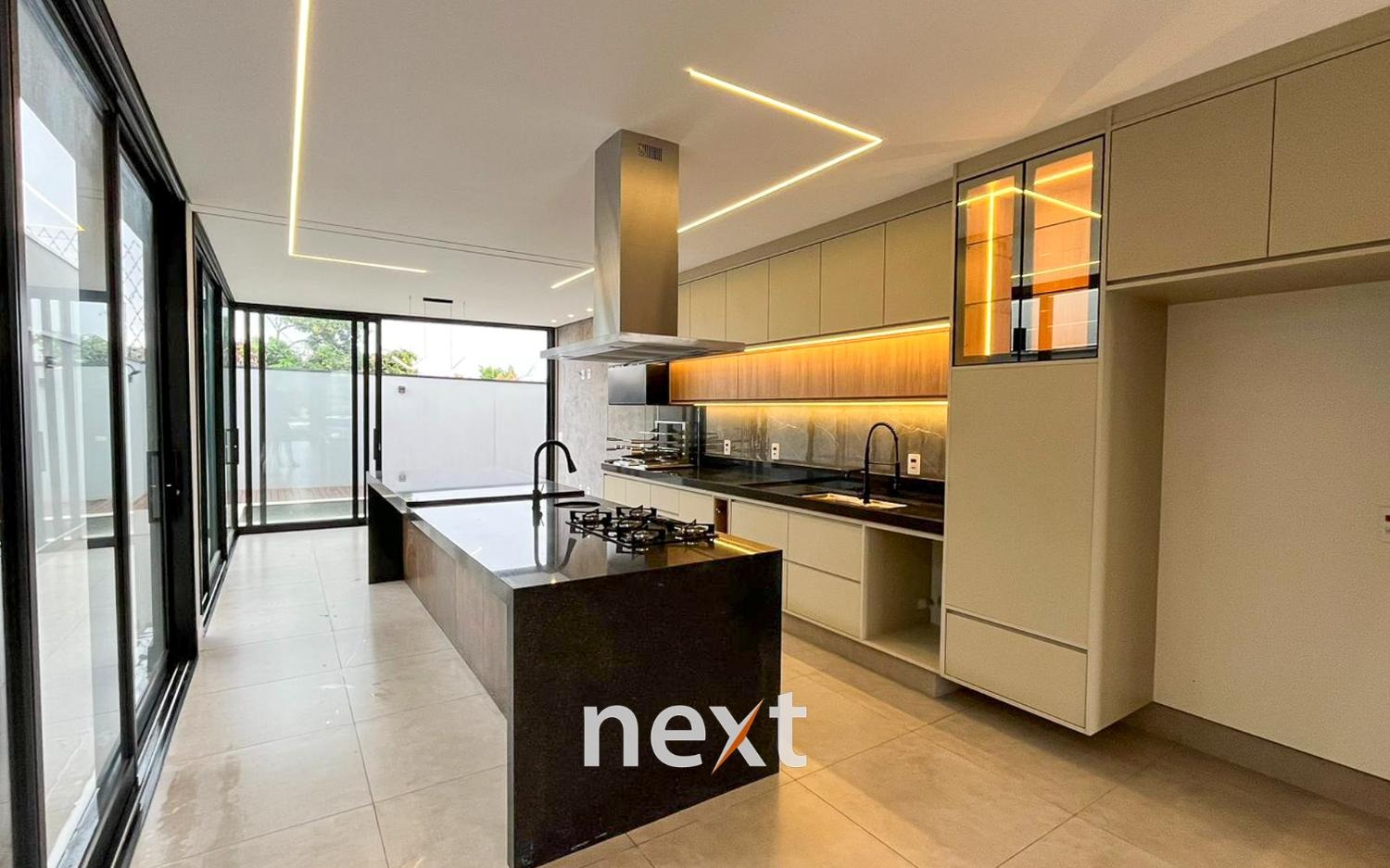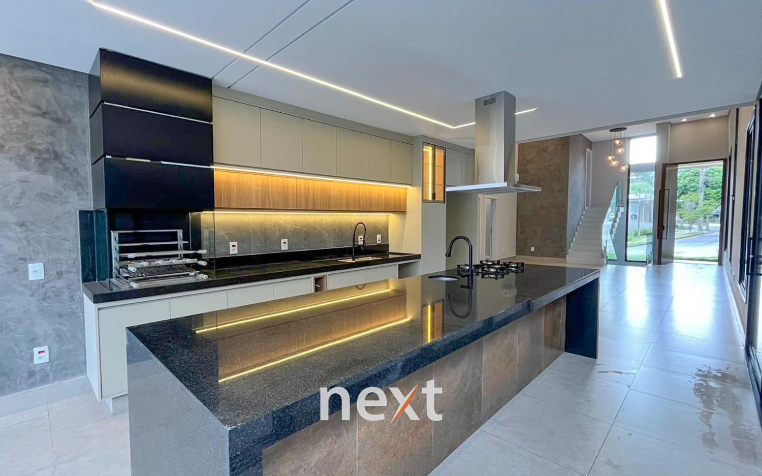 Cozinha planejada, com armários, cooktop e coifa de ilha, integrada à área da churrasqueira;