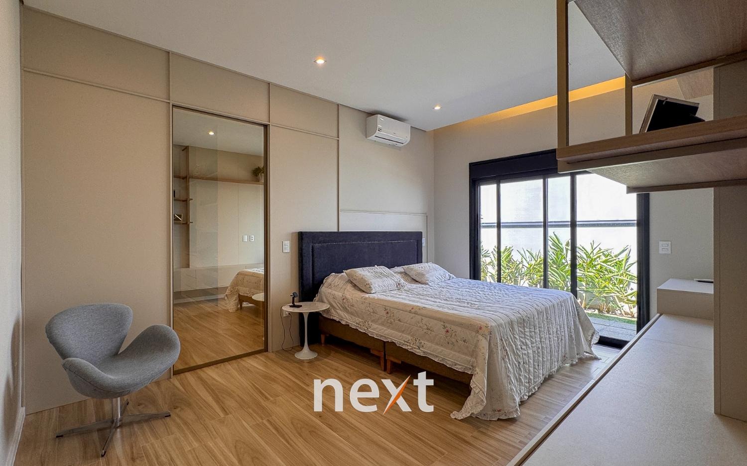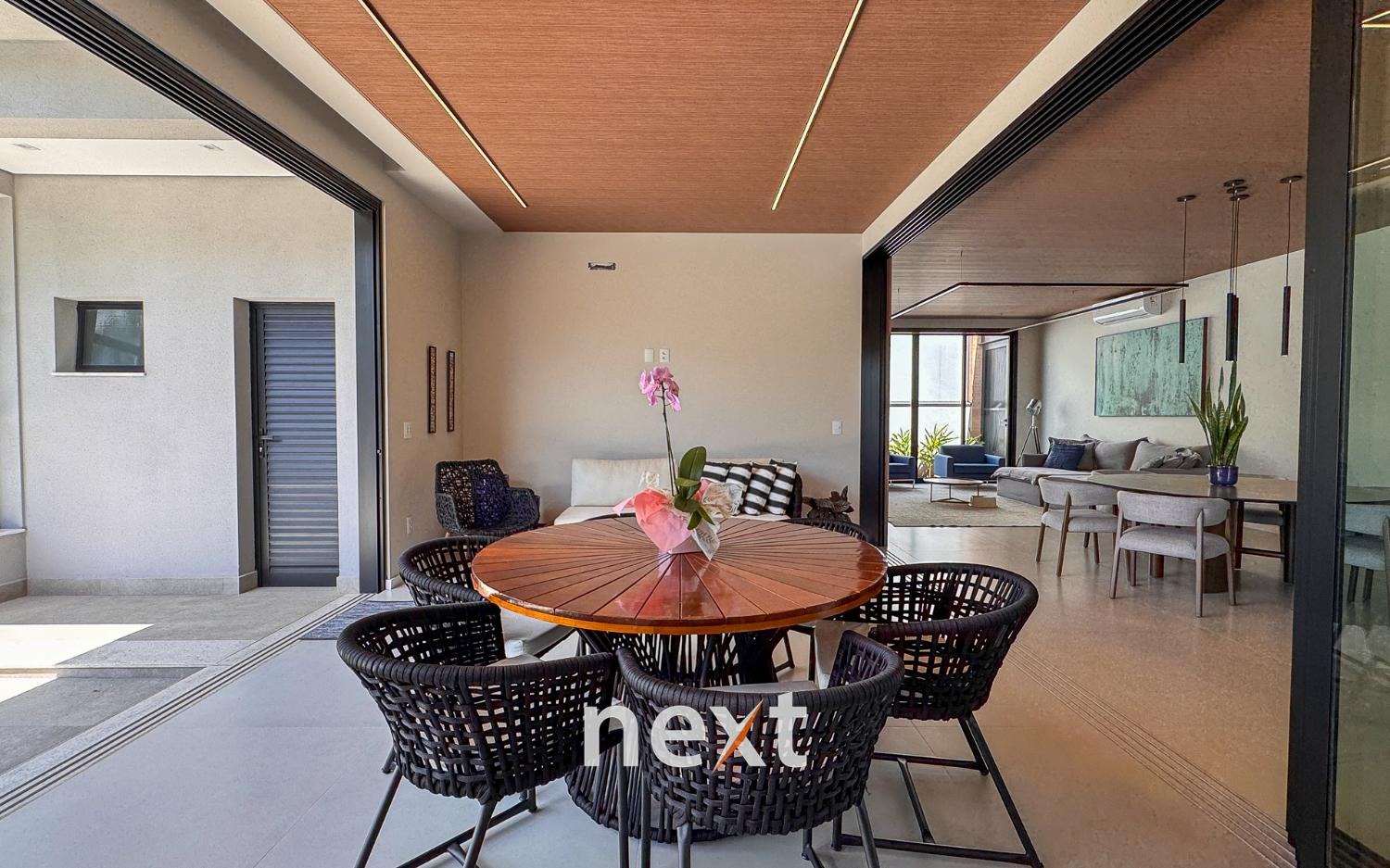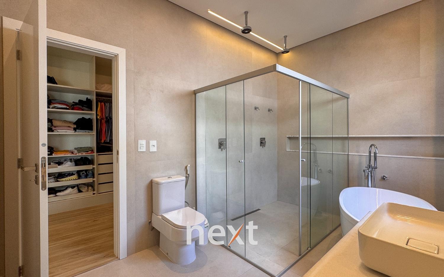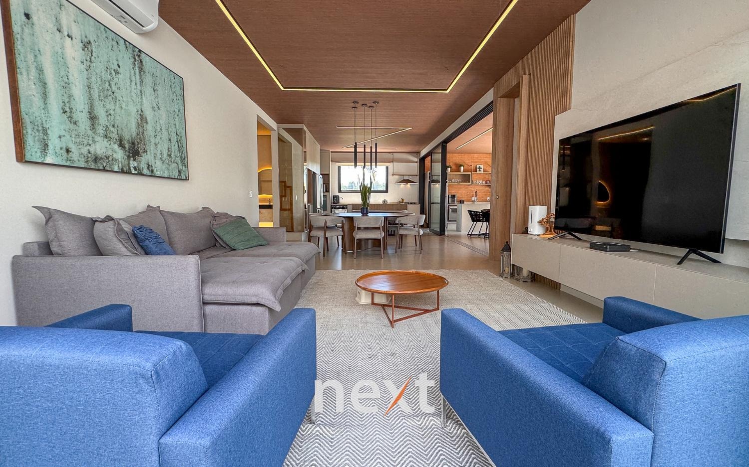 Casa térrea com 702m² de terreno e 320m² de construção, com 4 suítes (incluindo uma máster com closet e banheira), amplas salas de estar e jantar, cozinha planejada, lavanderia, banheiro externo e espaço gourmet com churrasqueira. Conta com 6 vagas (3 cobertas), ar-condicionado em todos os ambientes e persianas automatizadas. A marcenaria é completa em todos os cômodos e a iluminação é totalmente personalizada.