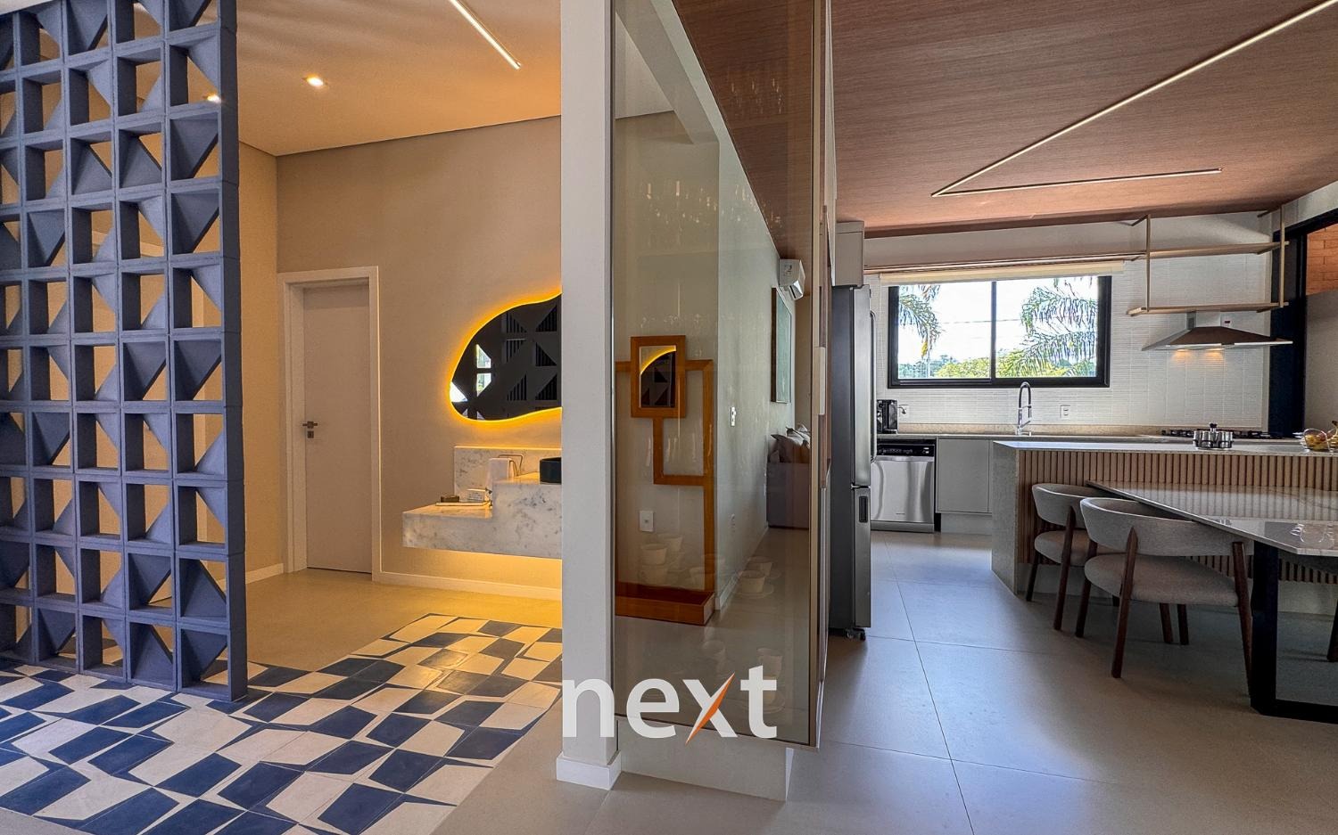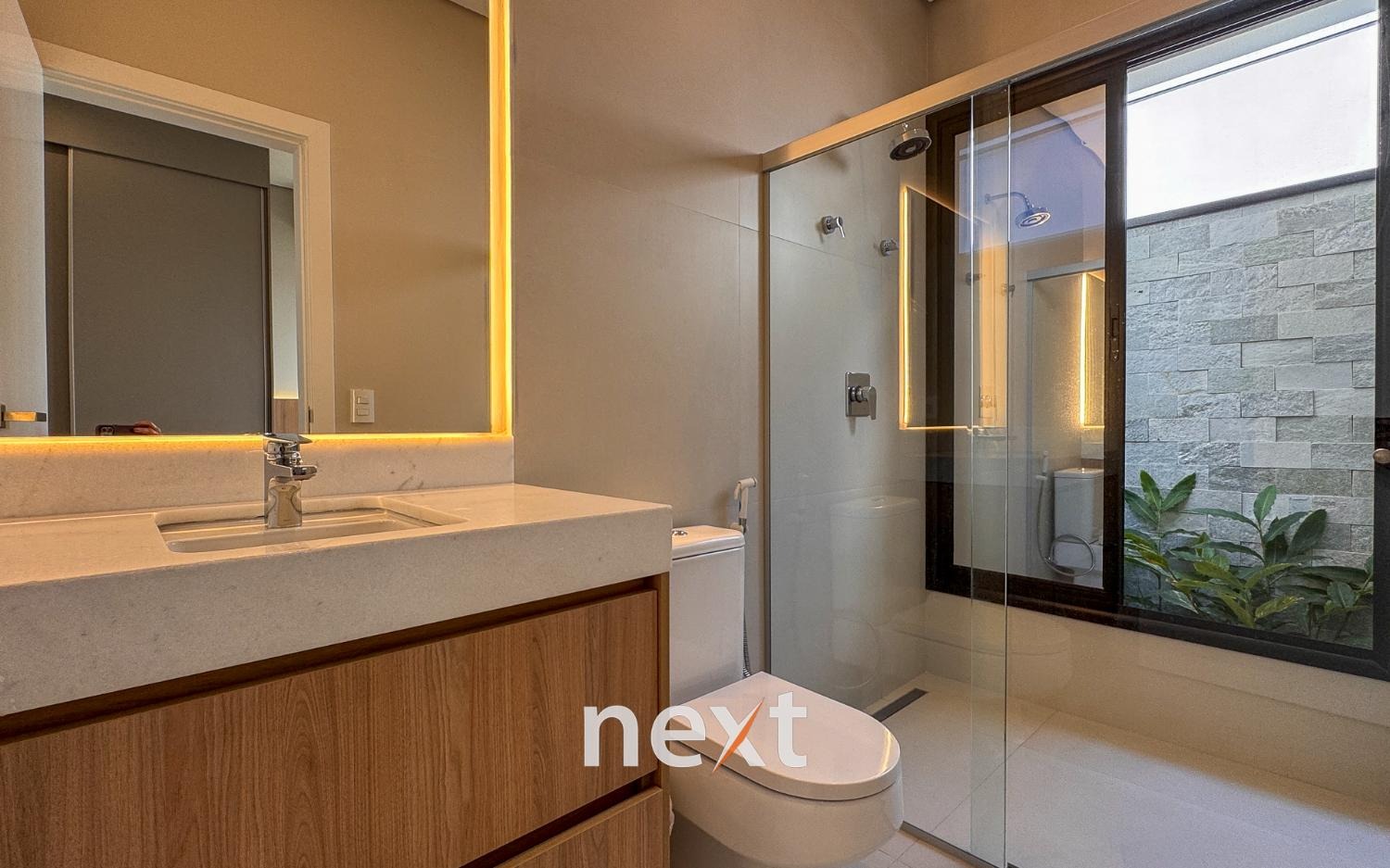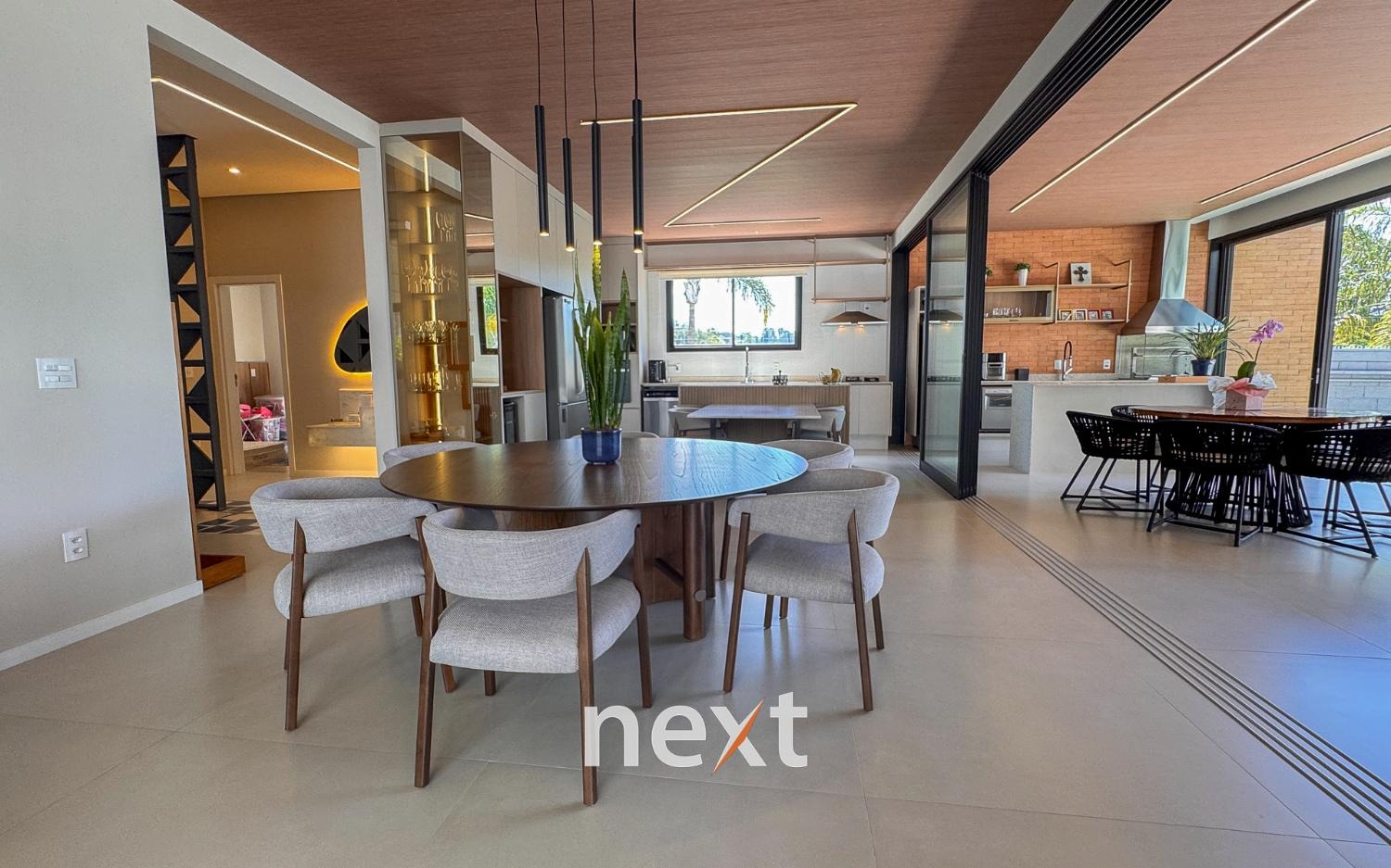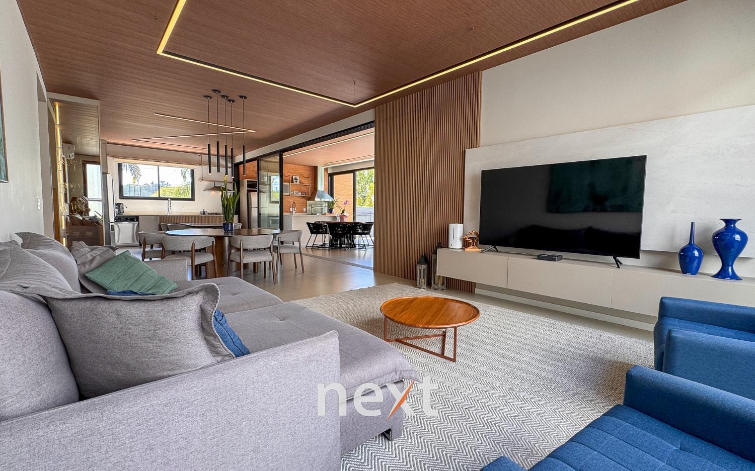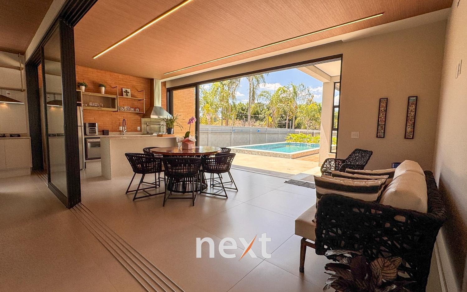 Casa térrea com 702m² de terreno e 320m² de construção, com 4 suítes (incluindo uma máster com closet e banheira), amplas salas de estar e jantar, cozinha planejada, lavanderia, banheiro externo e espaço gourmet com churrasqueira. Conta com 6 vagas (3 cobertas), ar-condicionado em todos os ambientes e persianas automatizadas. A marcenaria é completa em todos os cômodos e a iluminação é totalmente personalizada.