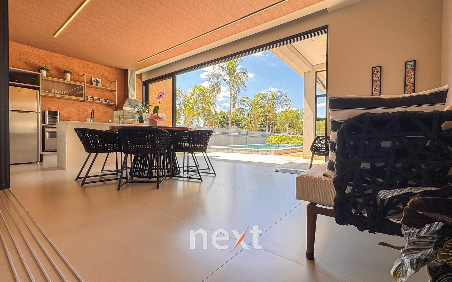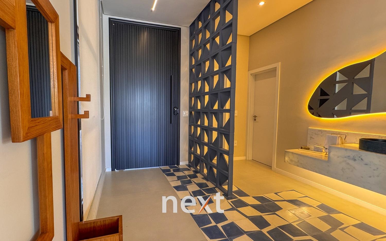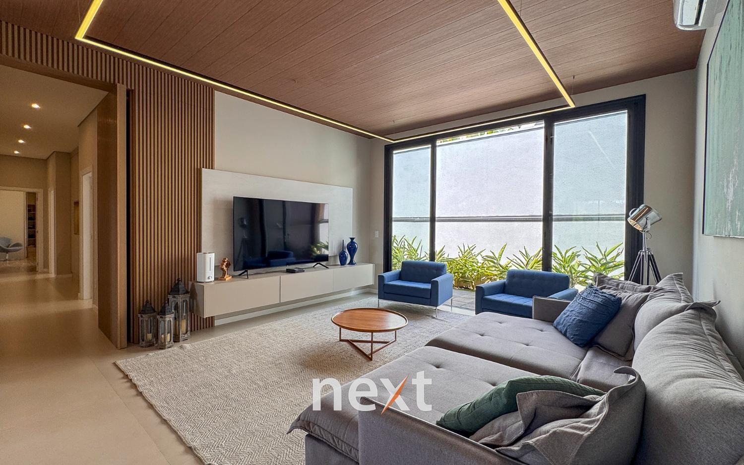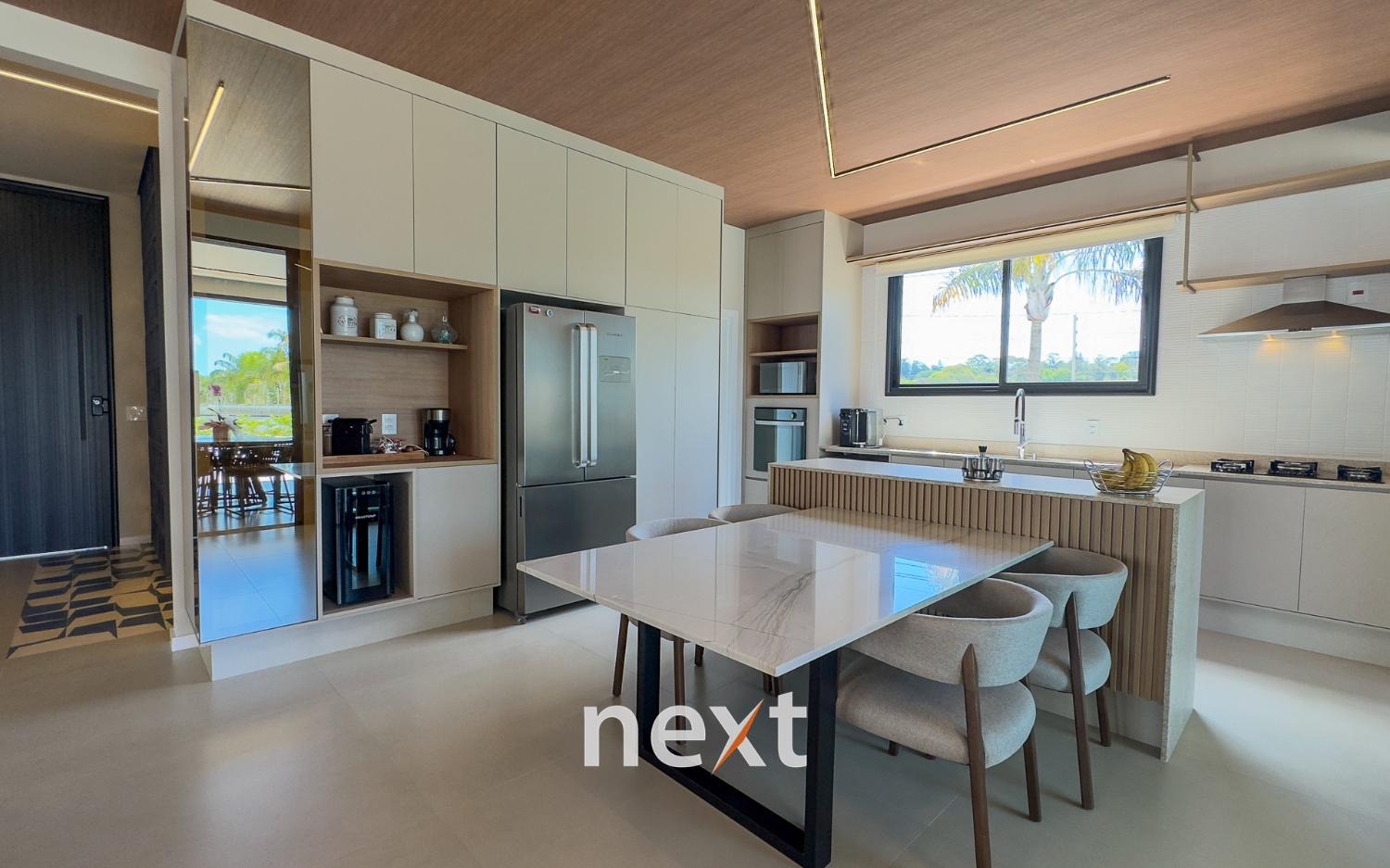 Casa térrea com 702m² de terreno e 320m² de construção, com 4 suítes (incluindo uma máster com closet e banheira), amplas salas de estar e jantar, cozinha planejada, lavanderia, banheiro externo e espaço gourmet com churrasqueira. Conta com 6 vagas (3 cobertas), ar-condicionado em todos os ambientes e persianas automatizadas. A marcenaria é completa em todos os cômodos e a iluminação é totalmente personalizada.