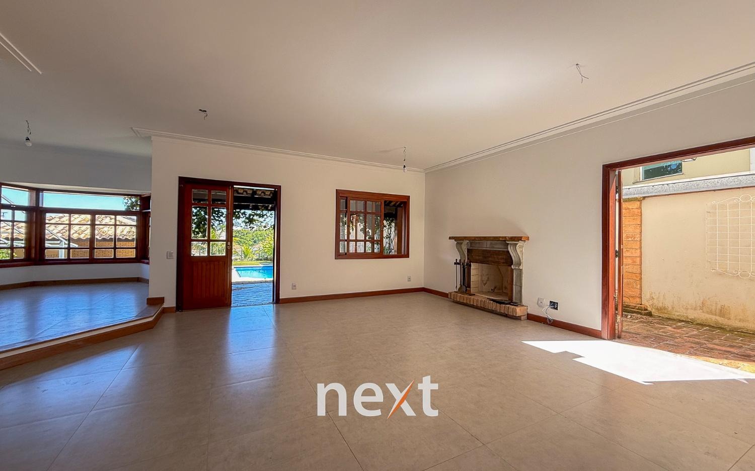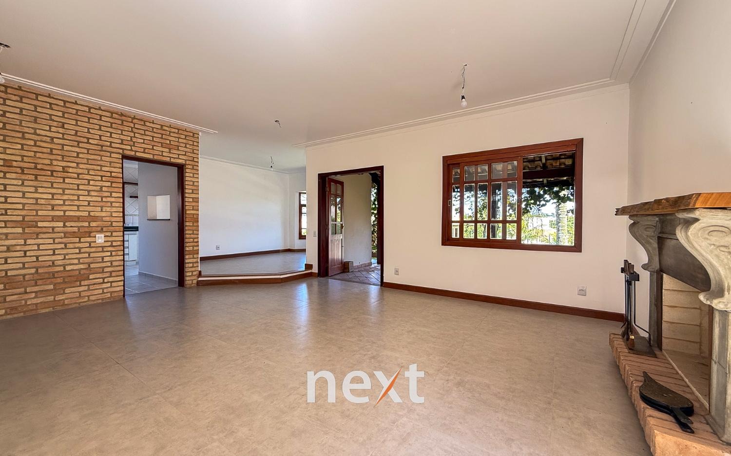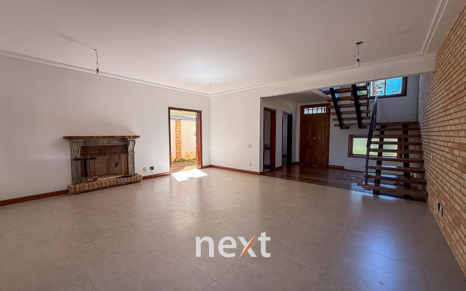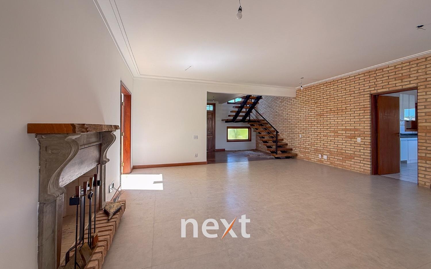 Sala de estar com lareira, sala de visitas, cozinha com móveis planejados e despensa e lavanderia.