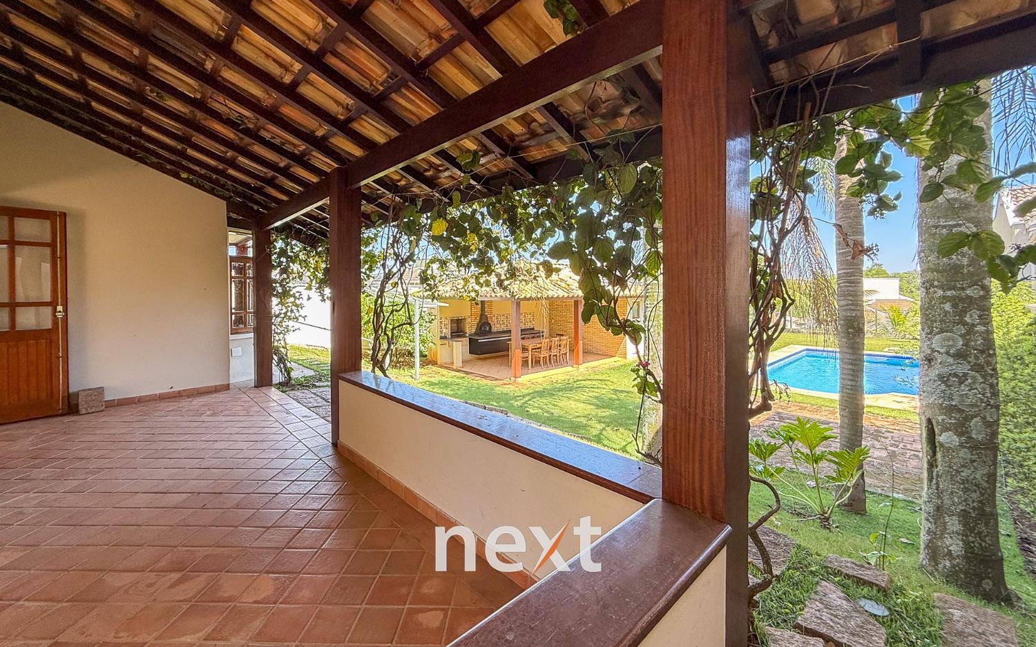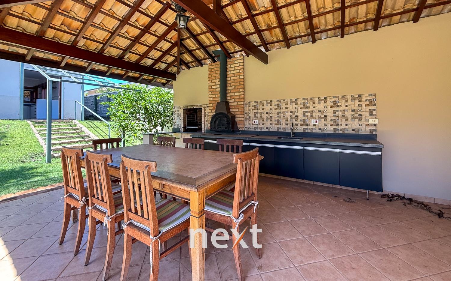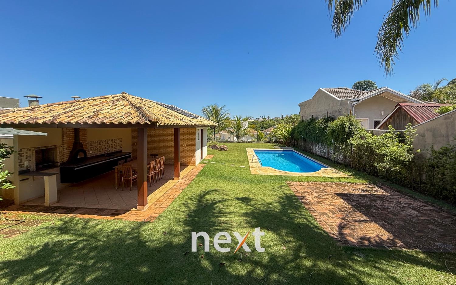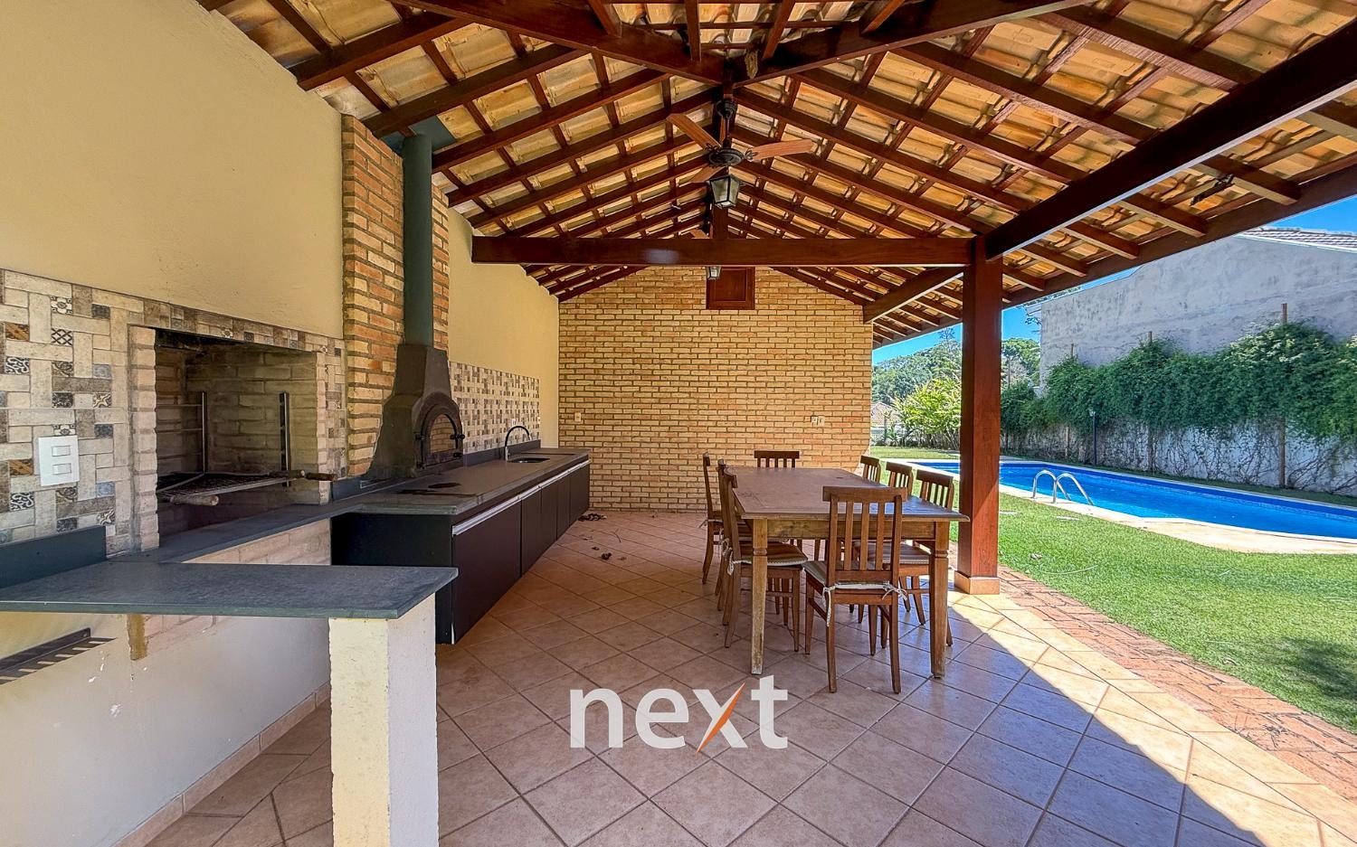 Área gourmet completa, com piscina, vestiário, com mesa e cadeiras.