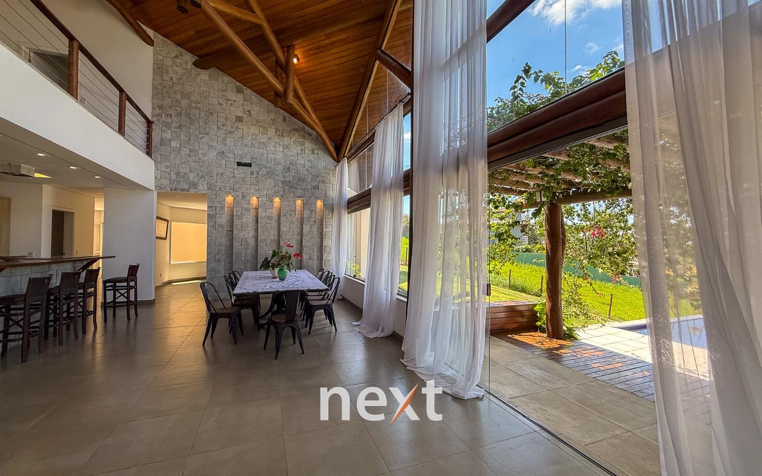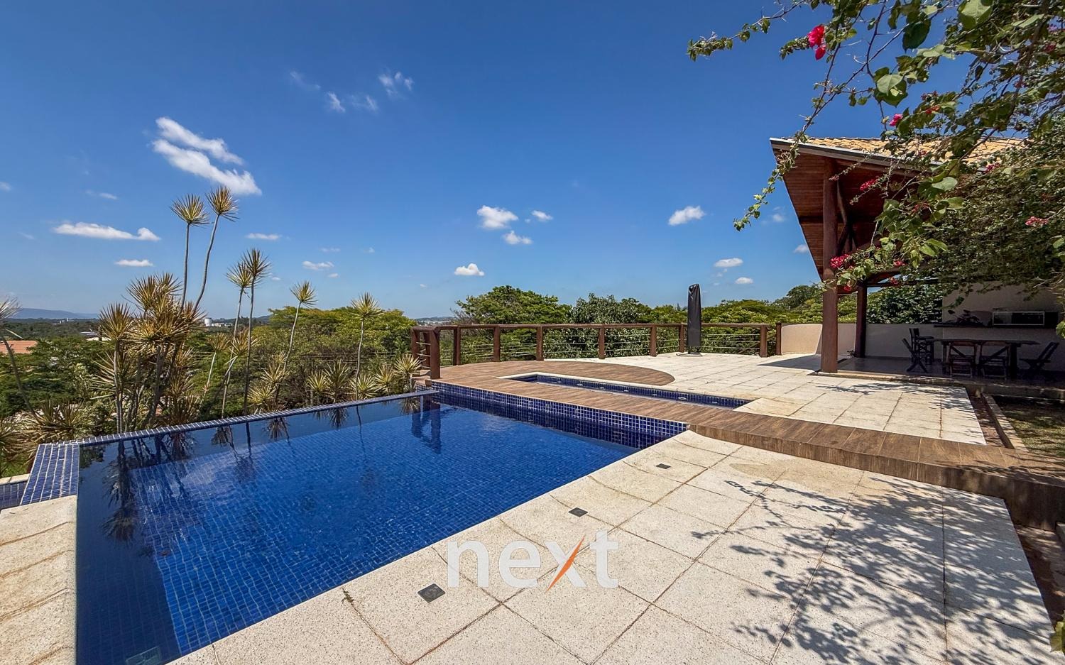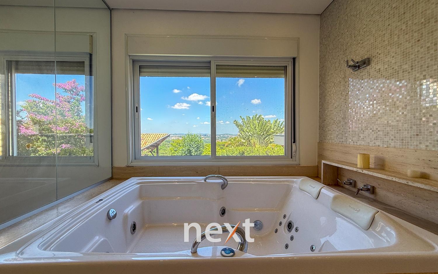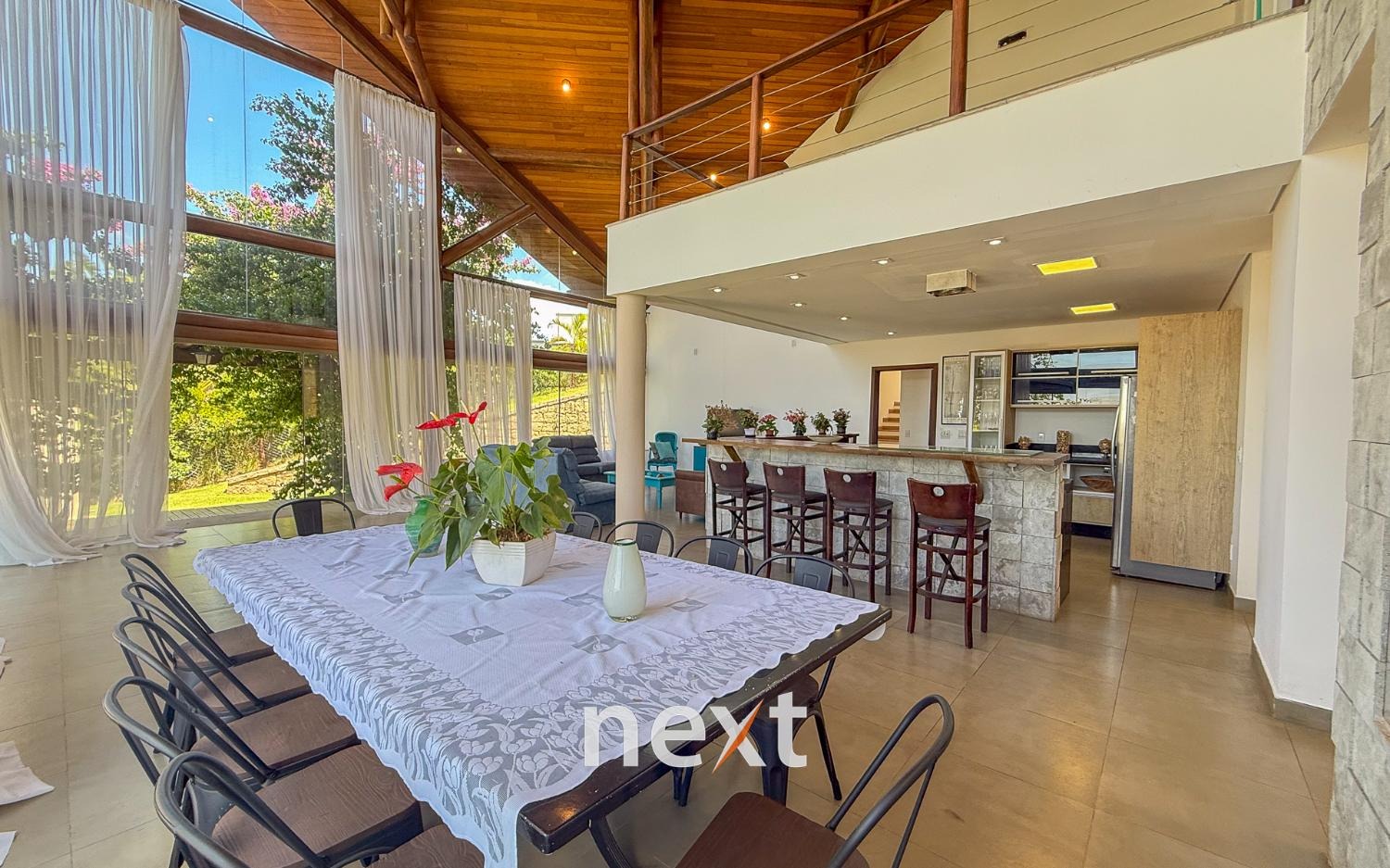 Com 1900 m² de terreno e 546 m² de construção, a casa conta com 5 suítes (sendo uma master com amplo espaço e hidro com vista ao por do Sol, 3 na parte superior, 1 no térreo e 1 externa de hóspedes), mezanino com vista frontal, lavabo, sala para até 3 ambientes toda envidraçada e em madeira com pé direito duplo, cozinha integrada com bancada, planejados e eletrodomésticos instalados, despensa, área de serviço e um salão para escritório, jogos ou qualquer uso que você defina. Na área externa amplo quintal gramado, piscina infinita, deck e passarela, área gourmet equipada e com banheiro e mais, tudo isso com vista para a Serra do Japi. Estrutura iniciada para a instalação de uma ampla sauna abaixo, garagem coberta para 2 ou 3 carros e descoberta para muito mais (total possibilidade de estruturar mais vagas cobertas abaixo, sem engavetamento). Estrutura de aquecimento solar, preparação para ar condicionado etc.