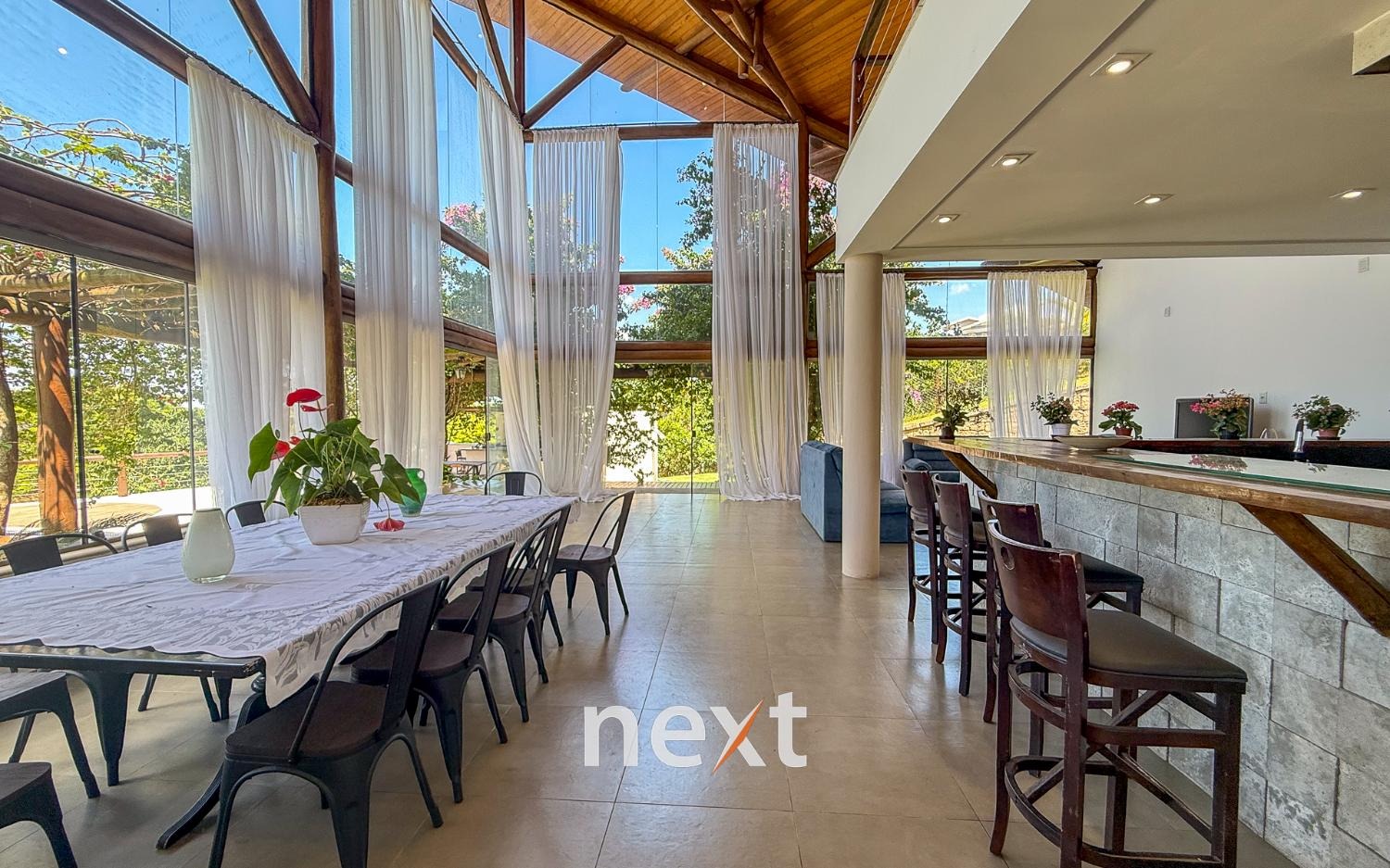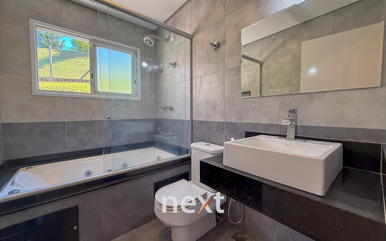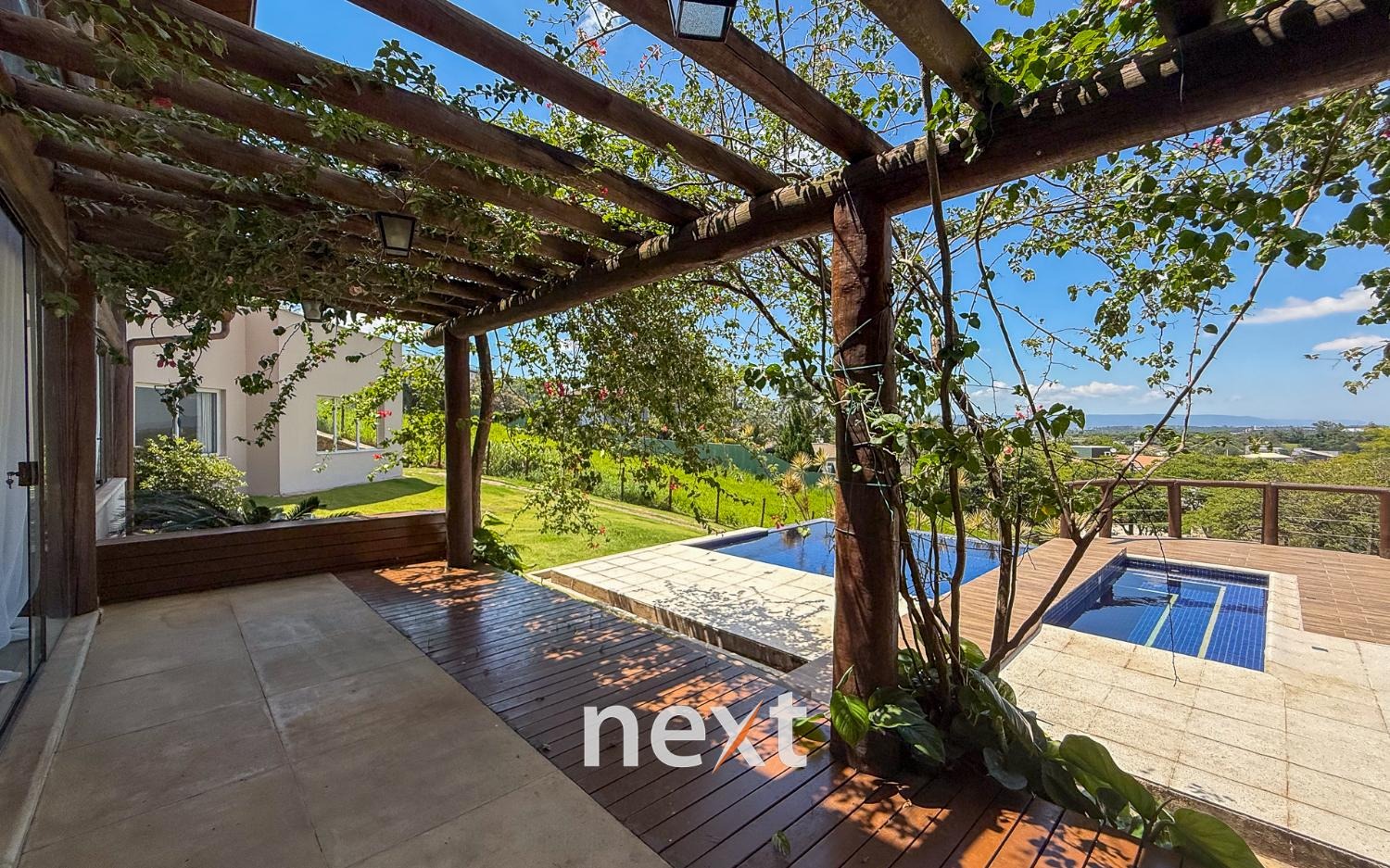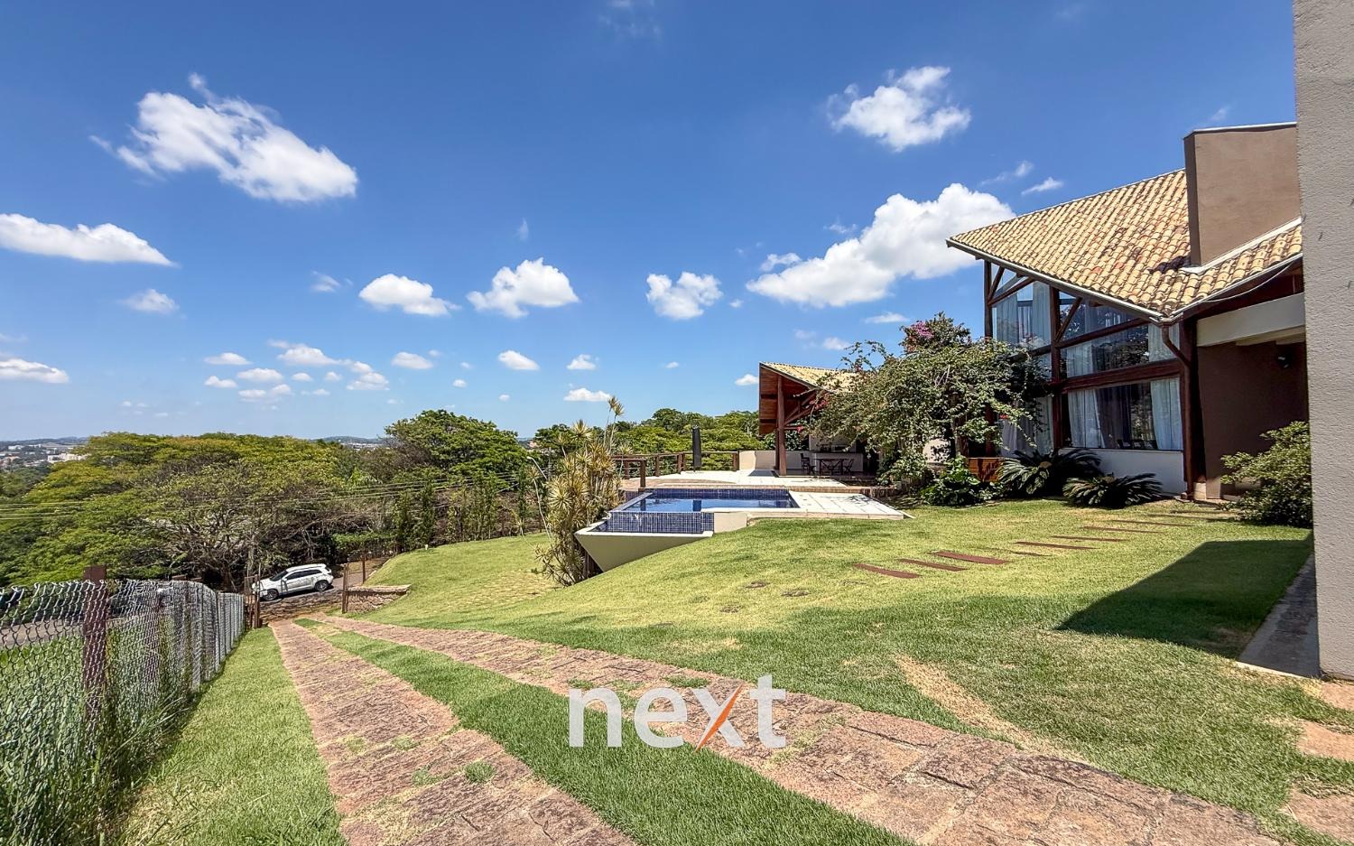 Com 1900 m² de terreno e 546 m² de construção, a casa conta com 5 suítes (sendo uma master com amplo espaço e hidro com vista ao por do Sol, 3 na parte superior, 1 no térreo e 1 externa de hóspedes), mezanino com vista frontal, lavabo, sala para até 3 ambientes toda envidraçada e em madeira com pé direito duplo, cozinha integrada com bancada, planejados e eletrodomésticos instalados, despensa, área de serviço e um salão para escritório, jogos ou qualquer uso que você defina. Na área externa amplo quintal gramado, piscina infinita, deck e passarela, área gourmet equipada e com banheiro e mais, tudo isso com vista para a Serra do Japi. Estrutura iniciada para a instalação de uma ampla sauna abaixo, garagem coberta para 2 ou 3 carros e descoberta para muito mais (total possibilidade de estruturar mais vagas cobertas abaixo, sem engavetamento). Estrutura de aquecimento solar, preparação para ar condicionado etc.