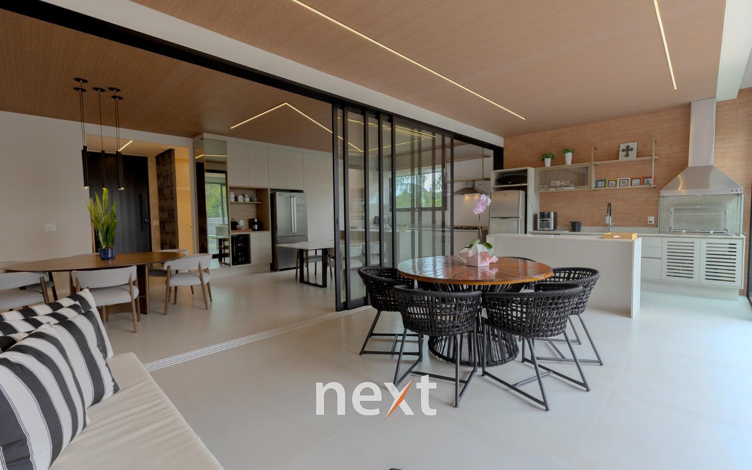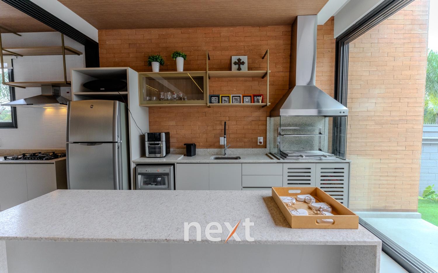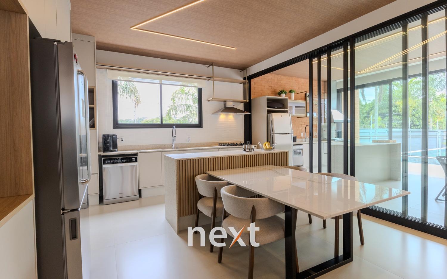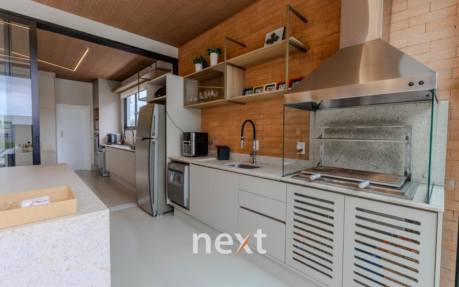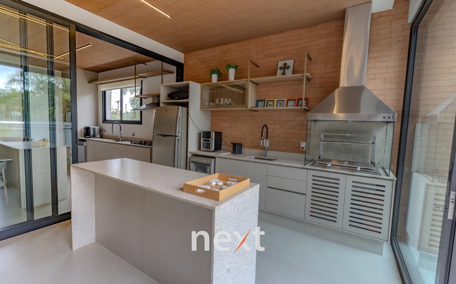Espaço gourmet integrado à cozinha por esquadrias deslizantes
