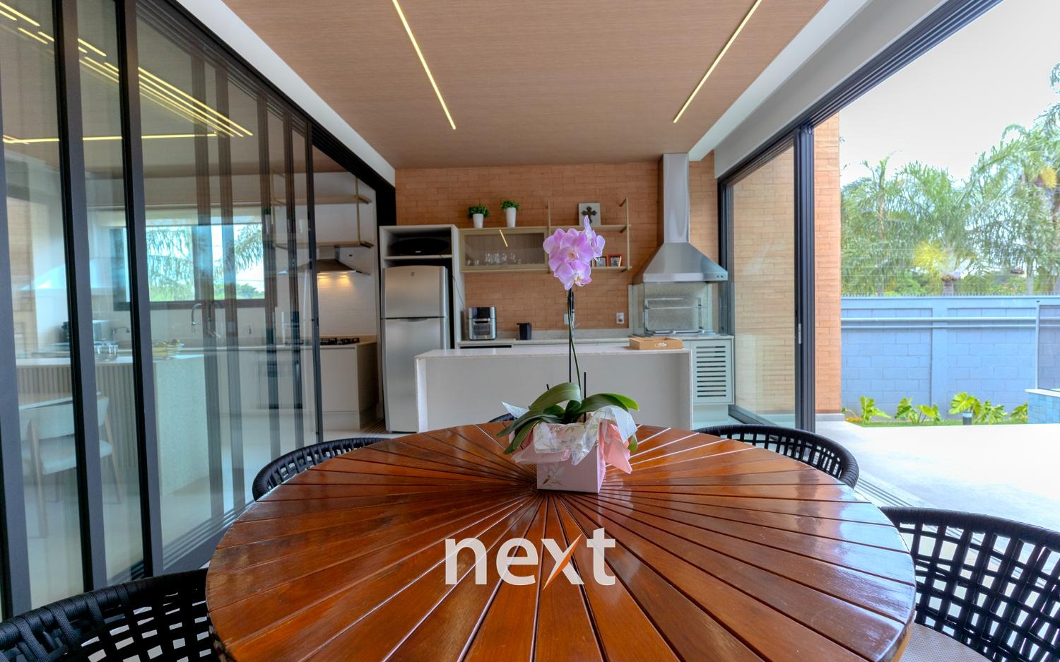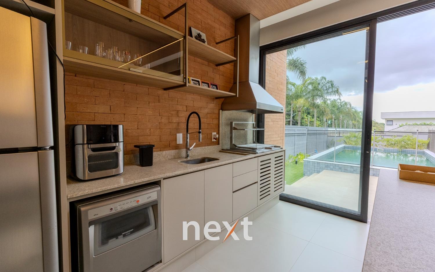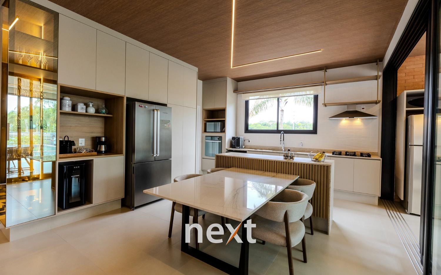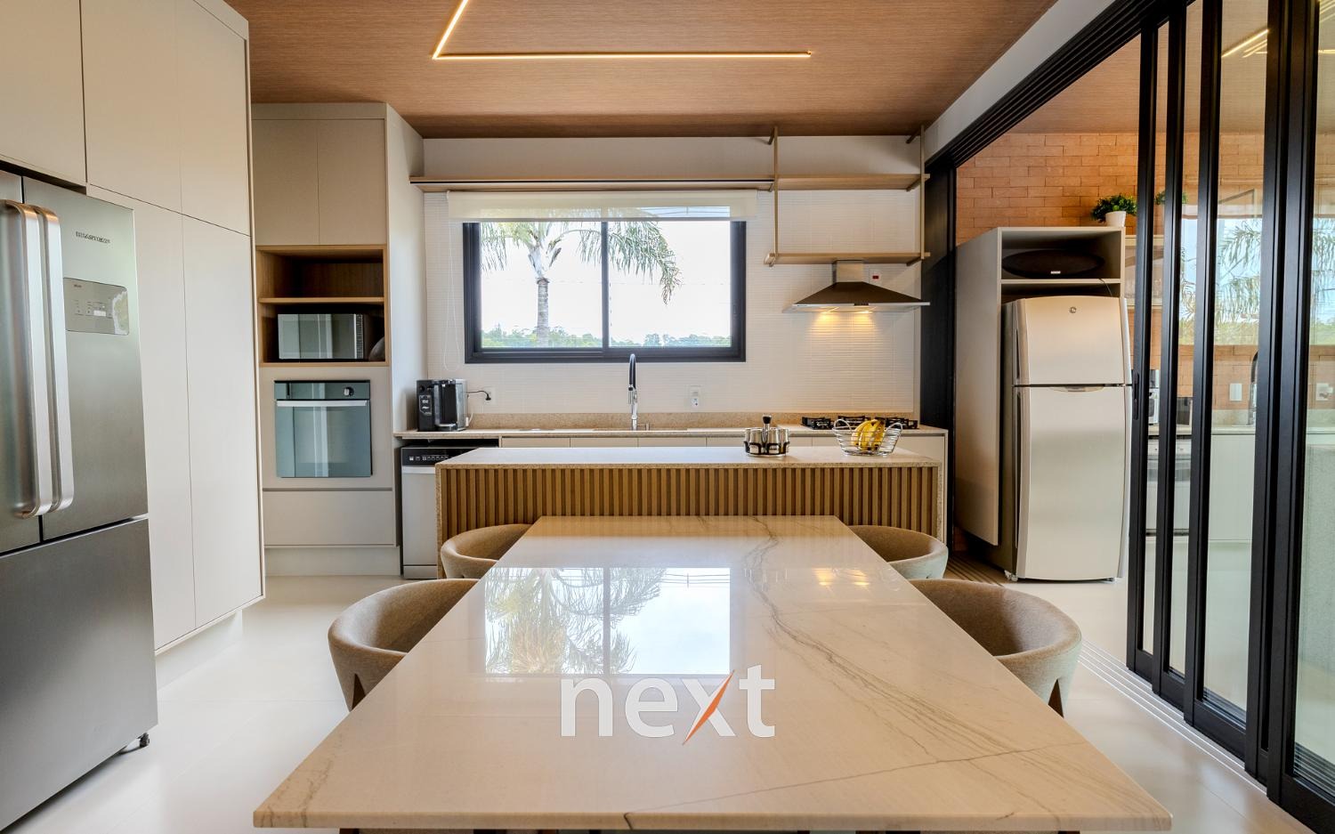 Espaço gourmet integrado à cozinha por esquadrias deslizantes