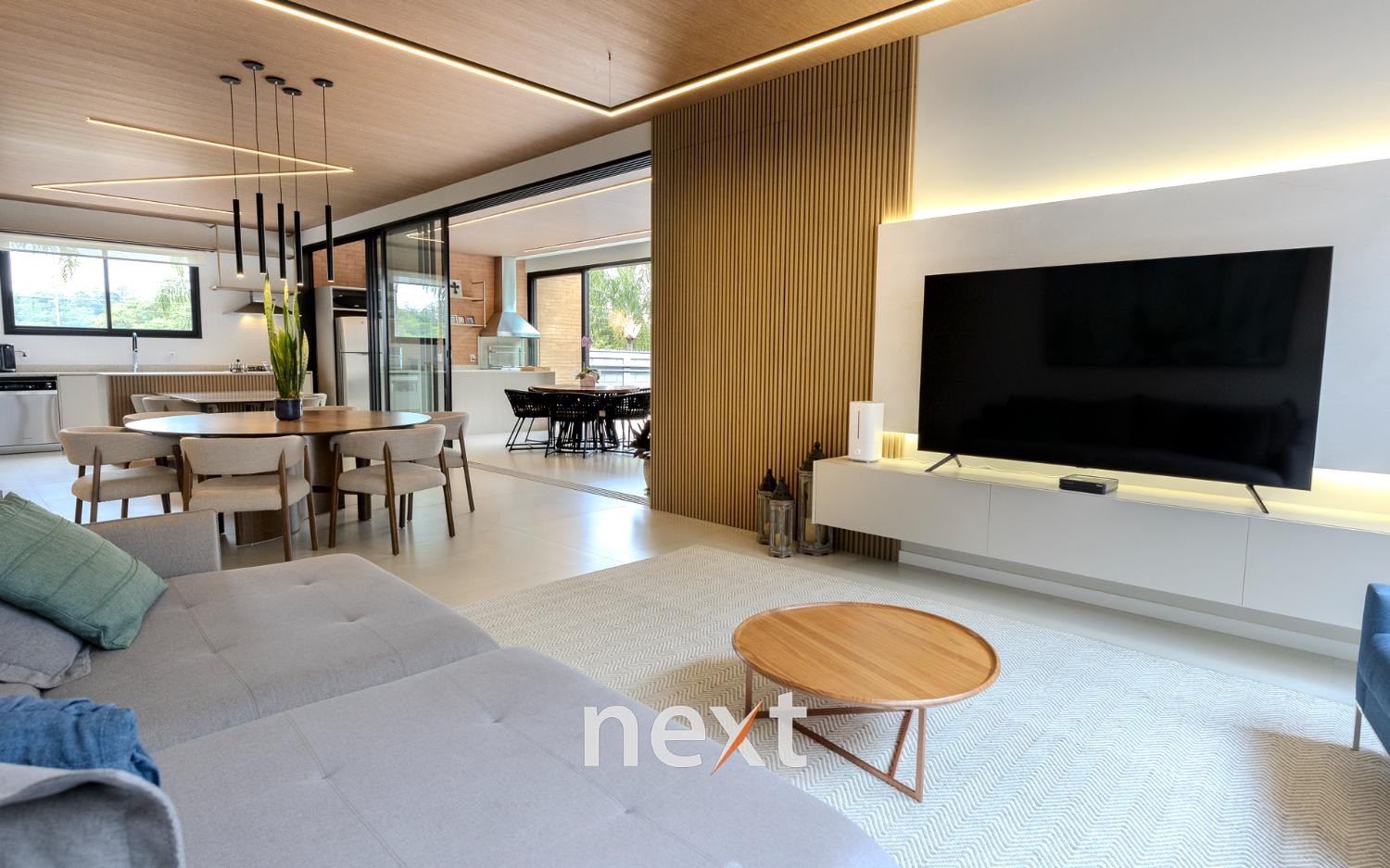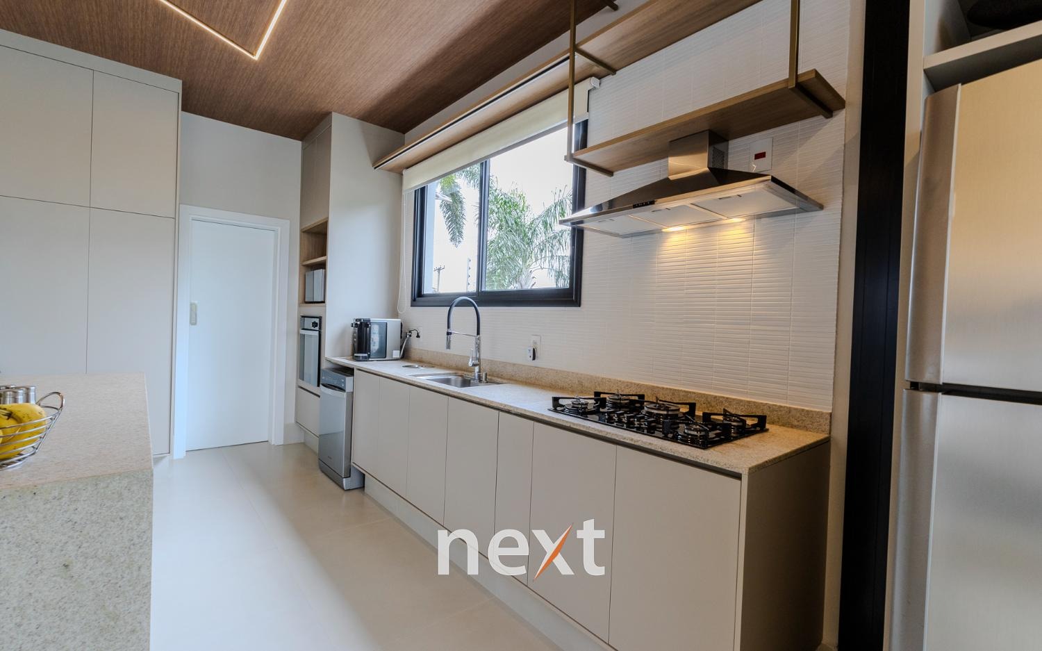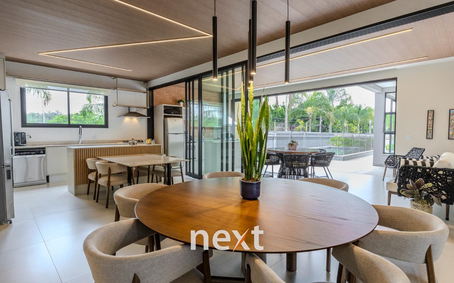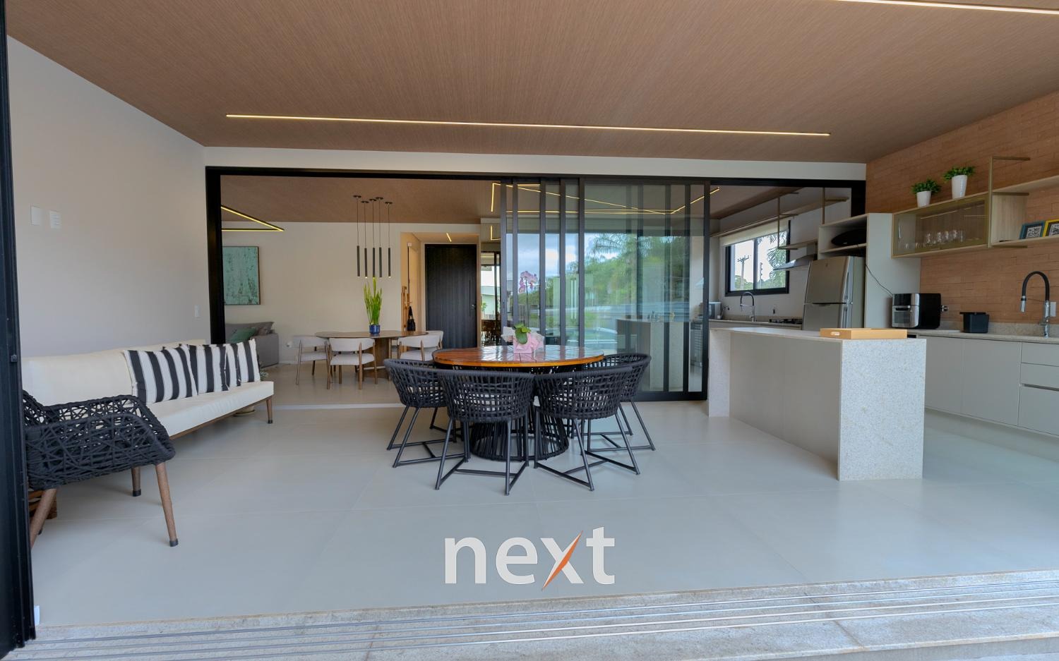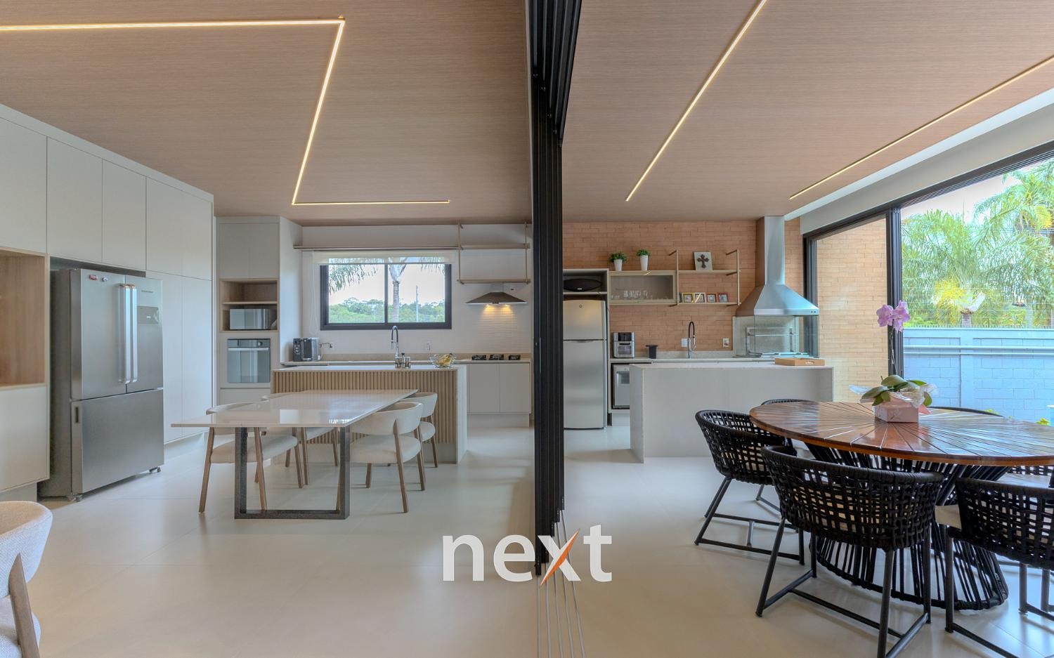 Espaço gourmet integrado à cozinha por esquadrias deslizantes