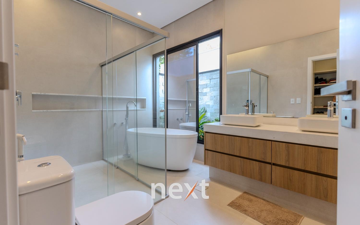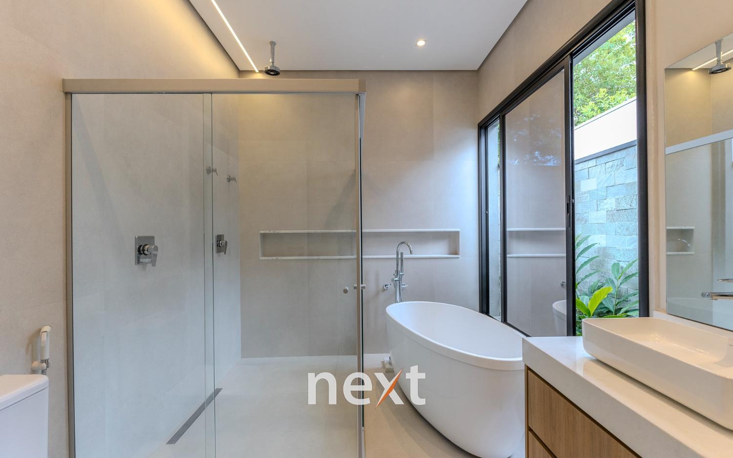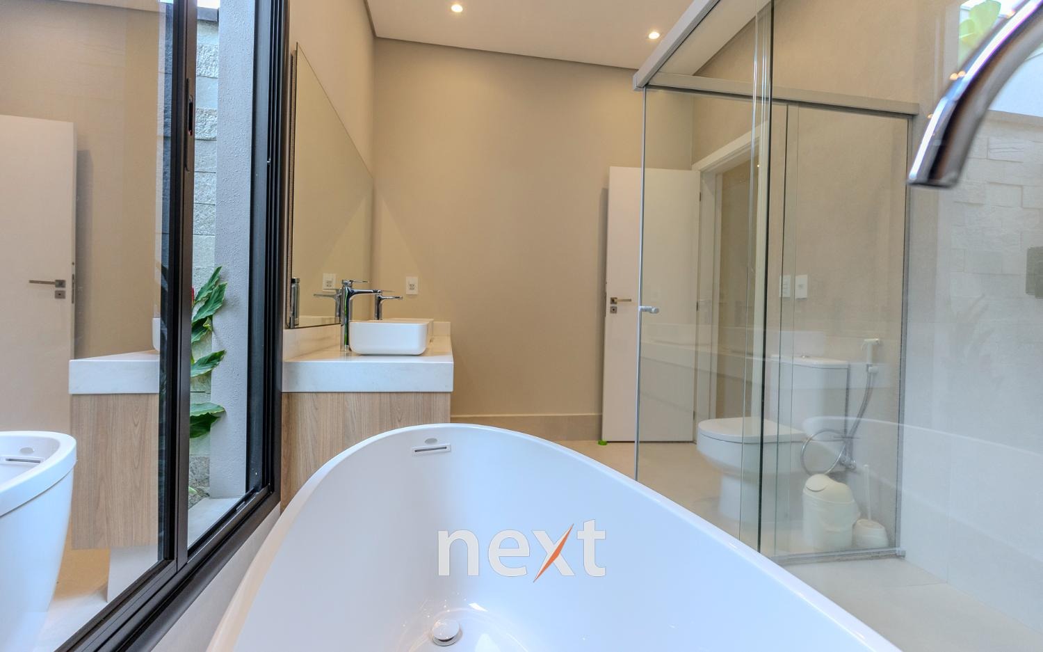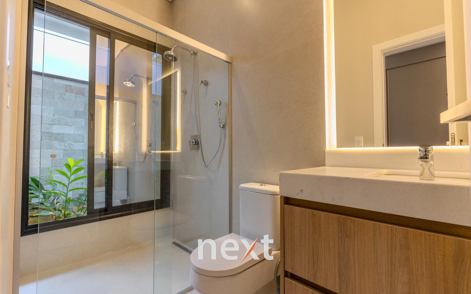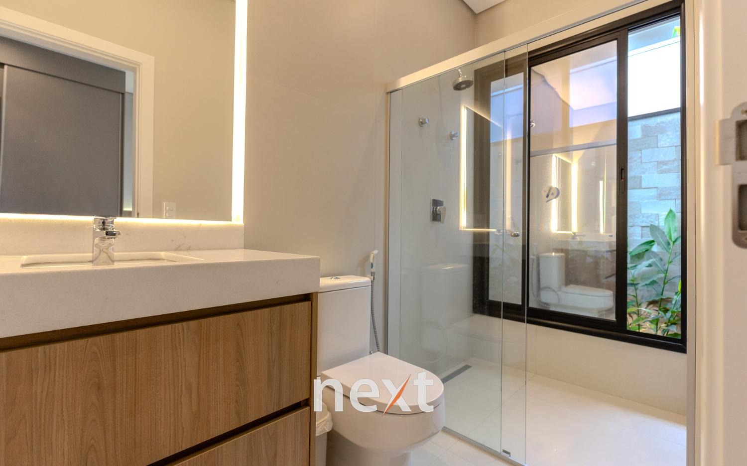 Todos os banheiros possuem fundo de box com floreira, trazendo charme e contato com a natureza.
