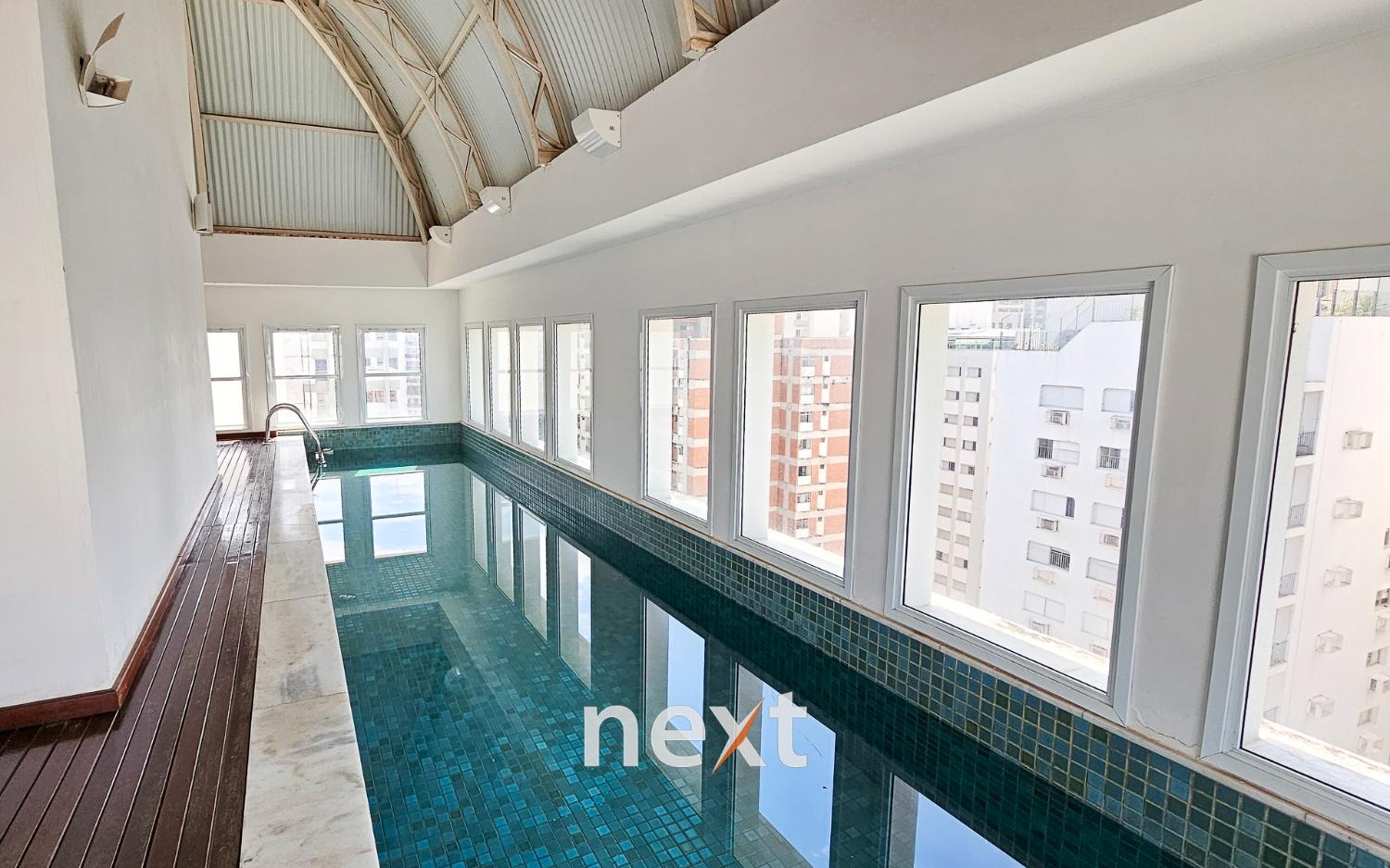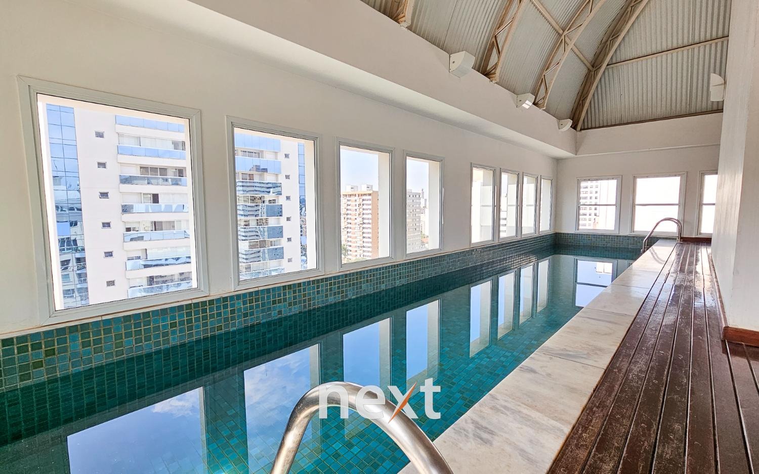 Lazer no rooftop com piscina coberta e academia. Salão de festas.
