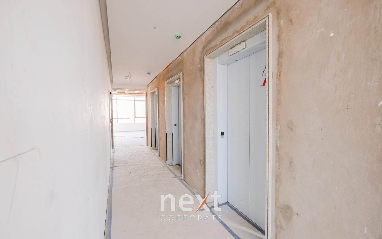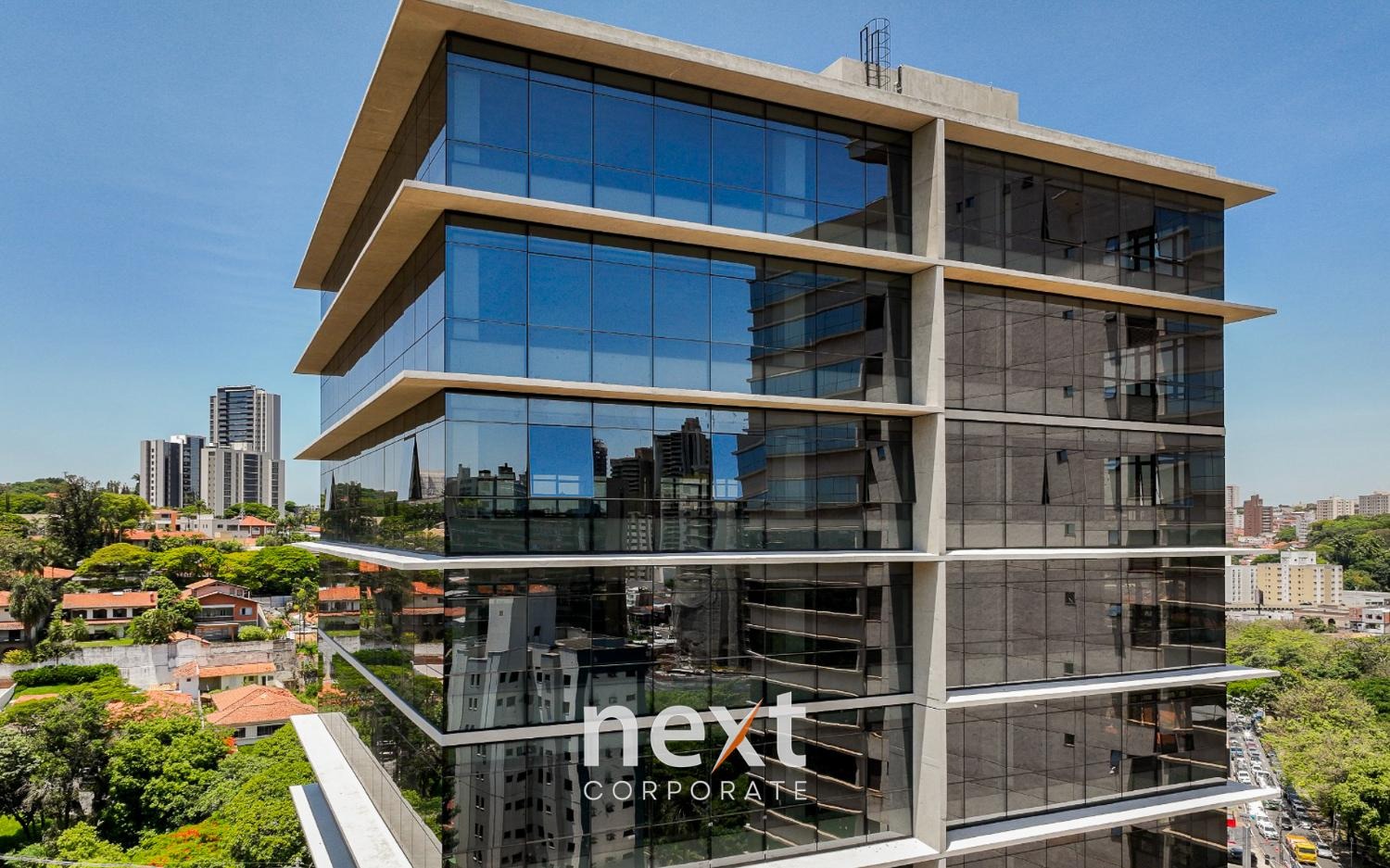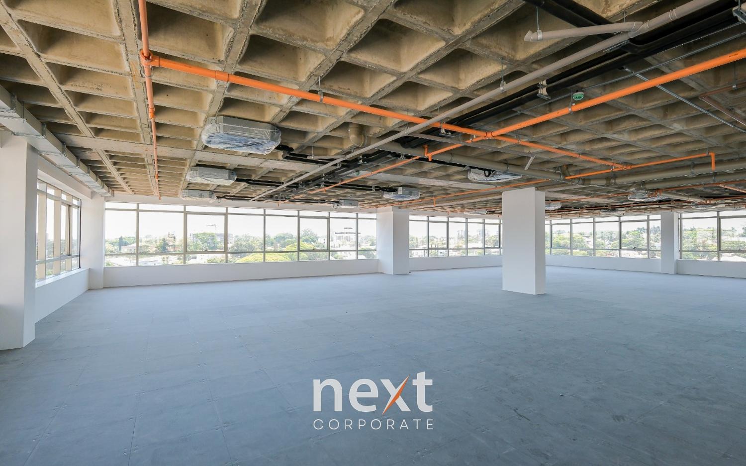 Laje preparada para piso elevado, forro com laje nervurada aparente, vidro de fachada laminado de alto desempenho, sprinklers.